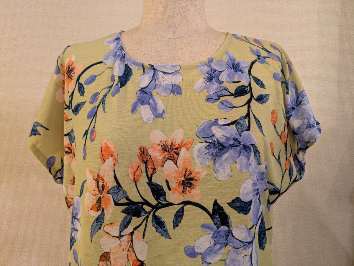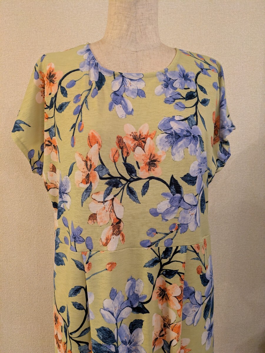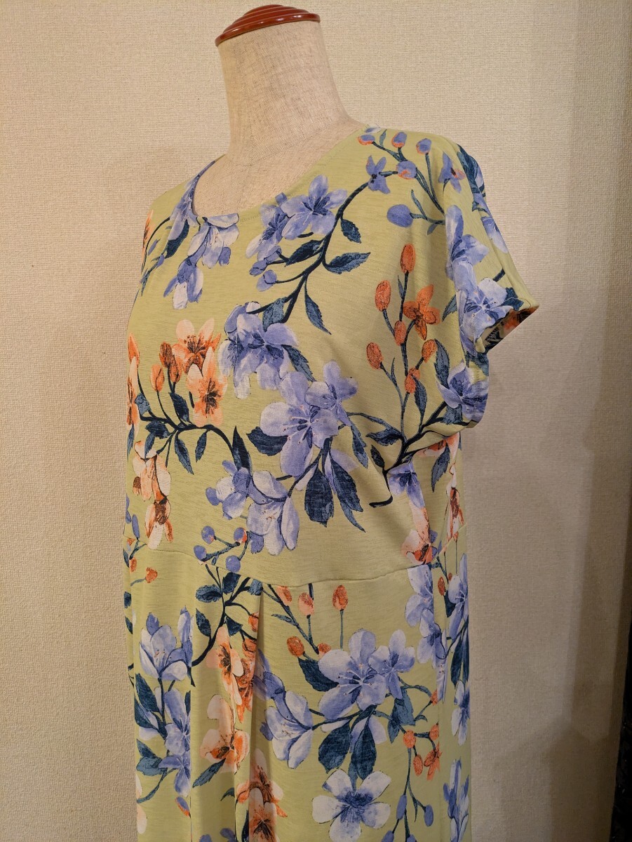 落ち着いた色調のイエローの地に、大きめな花柄プリントの、ニット生地です。