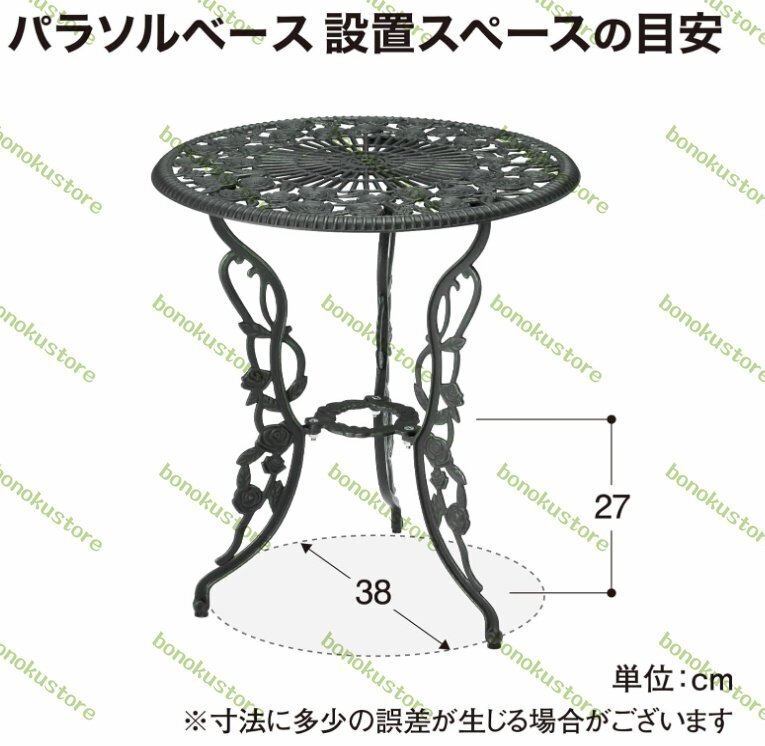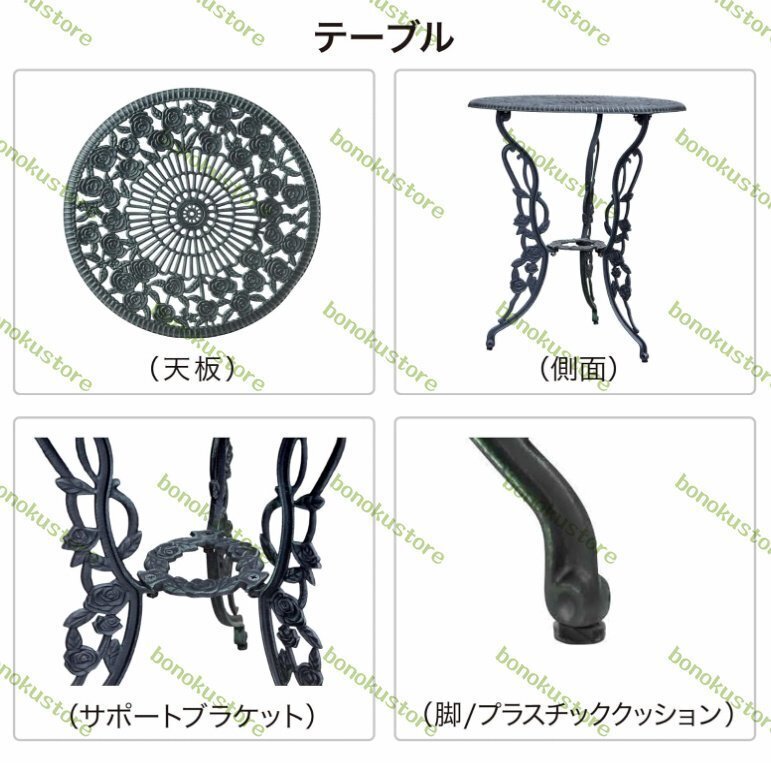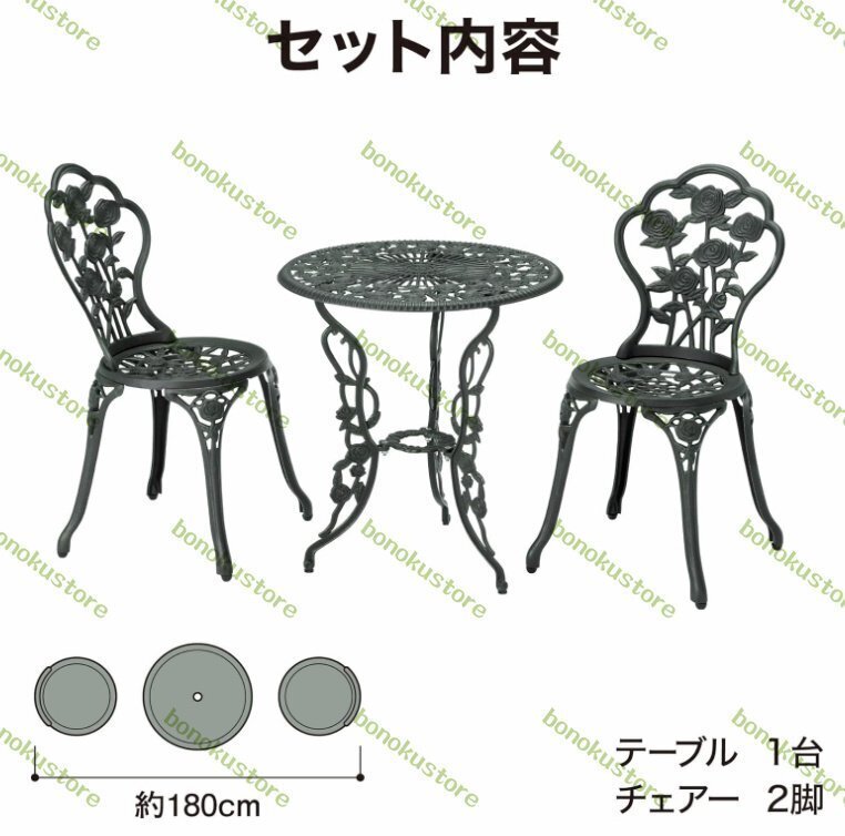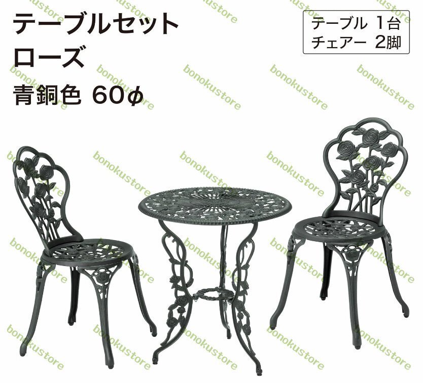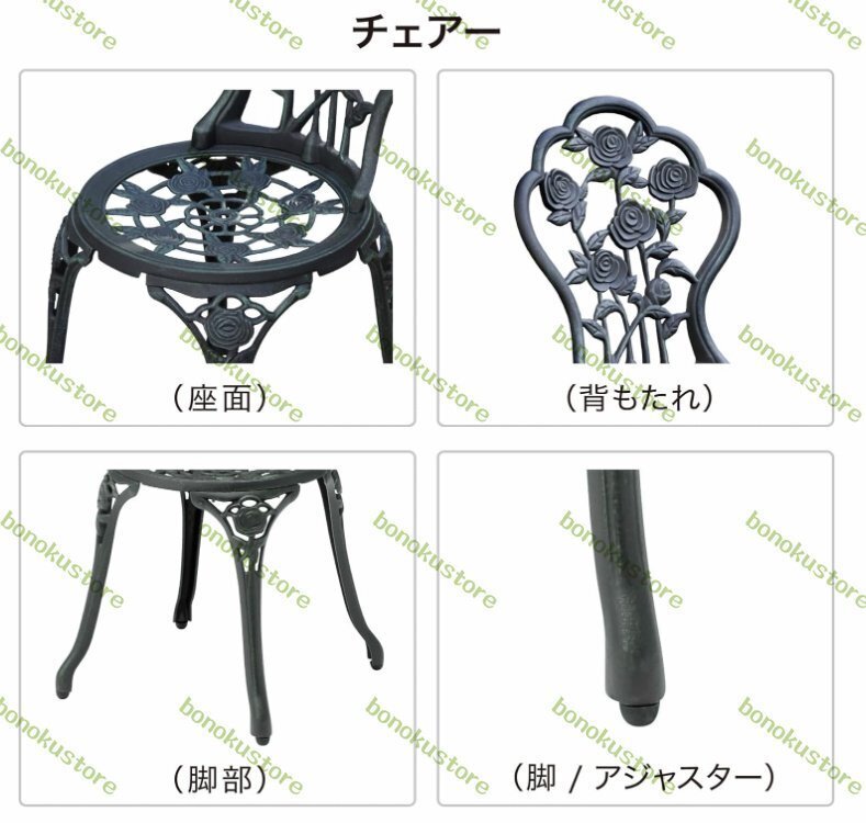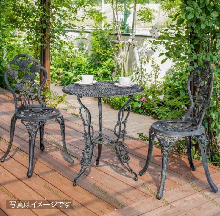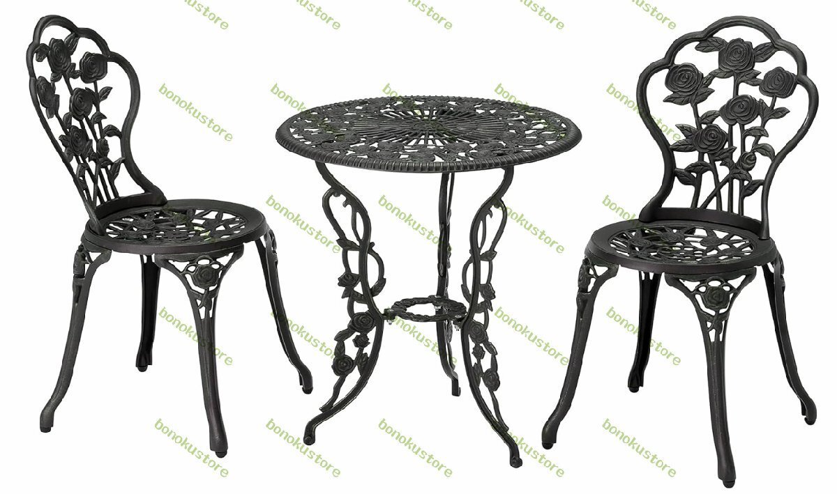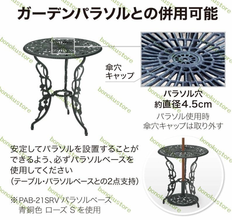 この商品についてバラをモチーフにしたアンティークなデザインのテーブル3点セット(テーブル1台・チェアー2脚)。ローズ柄のファニチャーなので植物を引き立て、置くだけでもガーデンスペースを華やかに演出してくれます。直径約4.5cmのパラソル穴があるので、別売のパラソルを