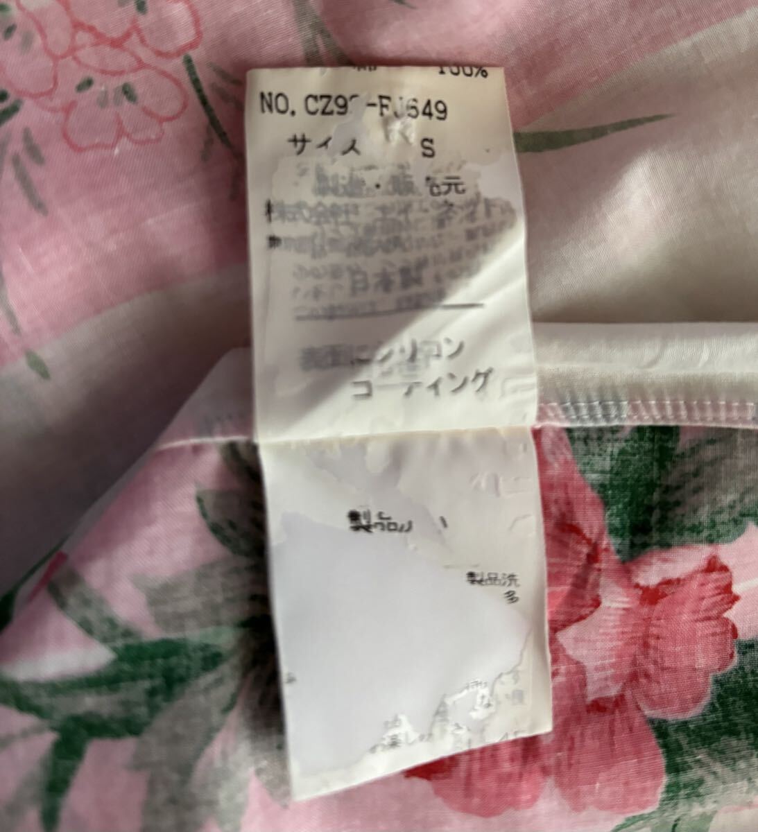 品質表示がクリーニングに出した際、圧着したようでプリントが剥がれています(写真9枚目ご参照ください)