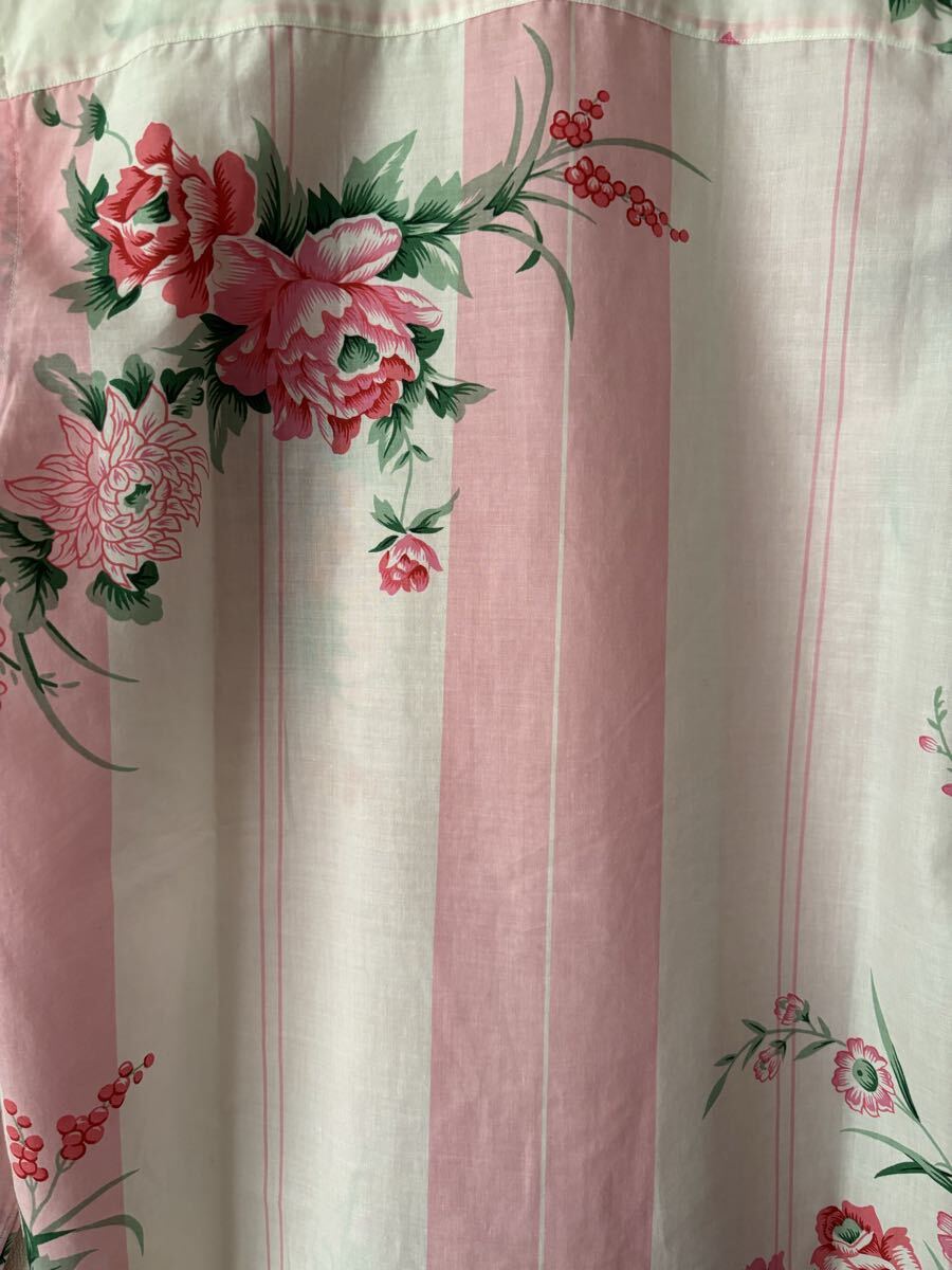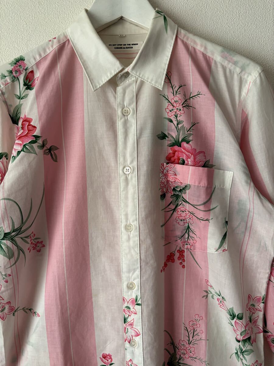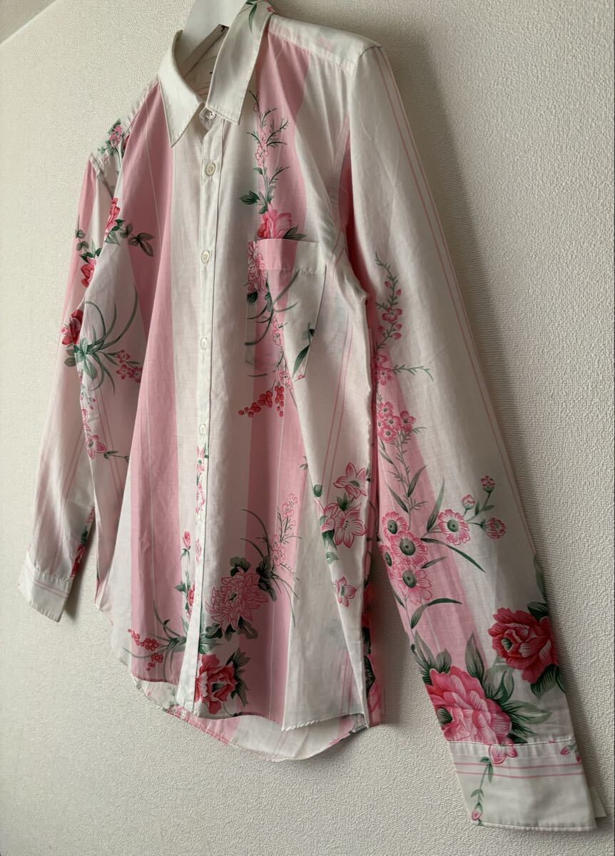 ピンクと白のストライプに花柄プリントの長袖シャツ。
