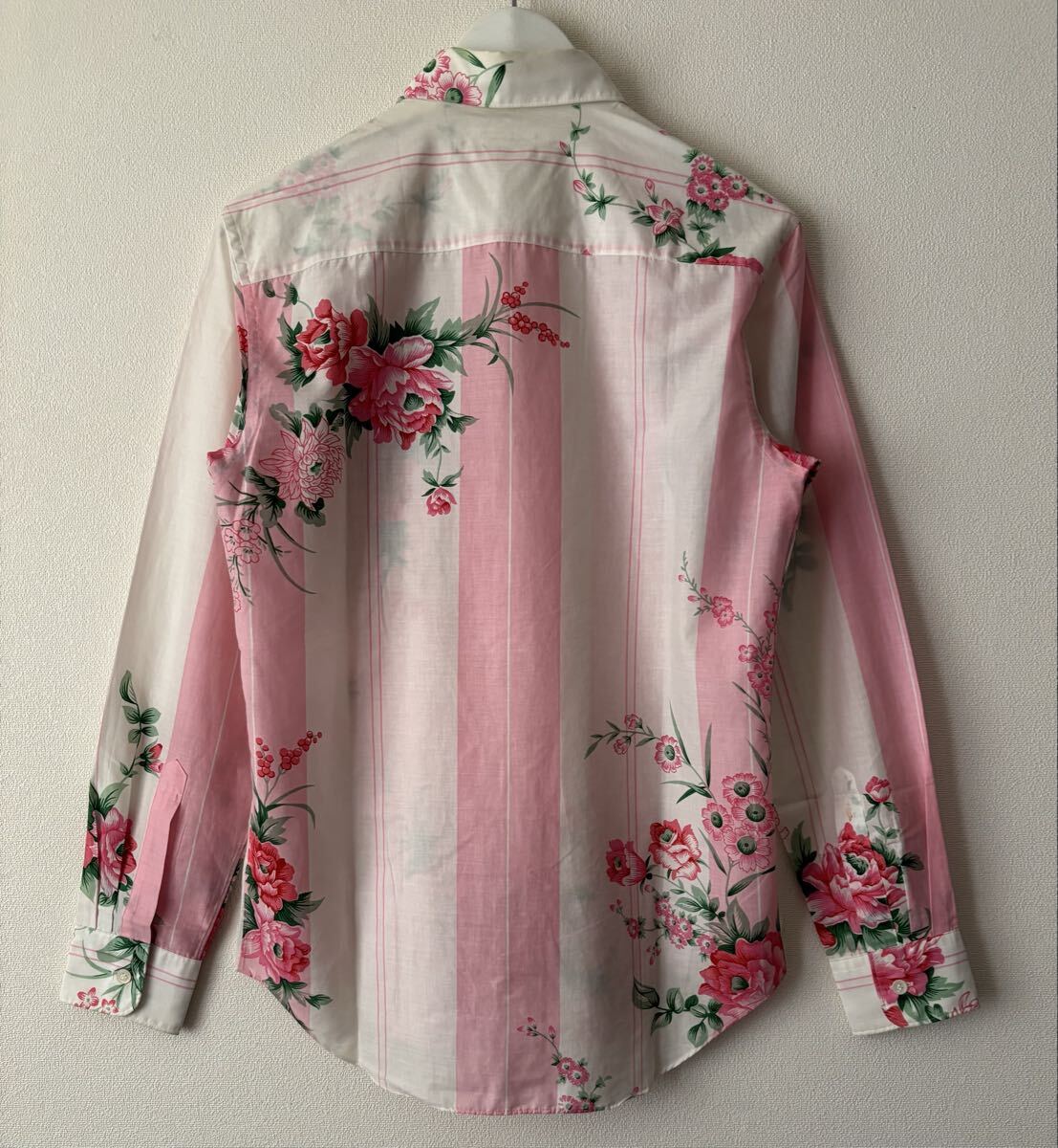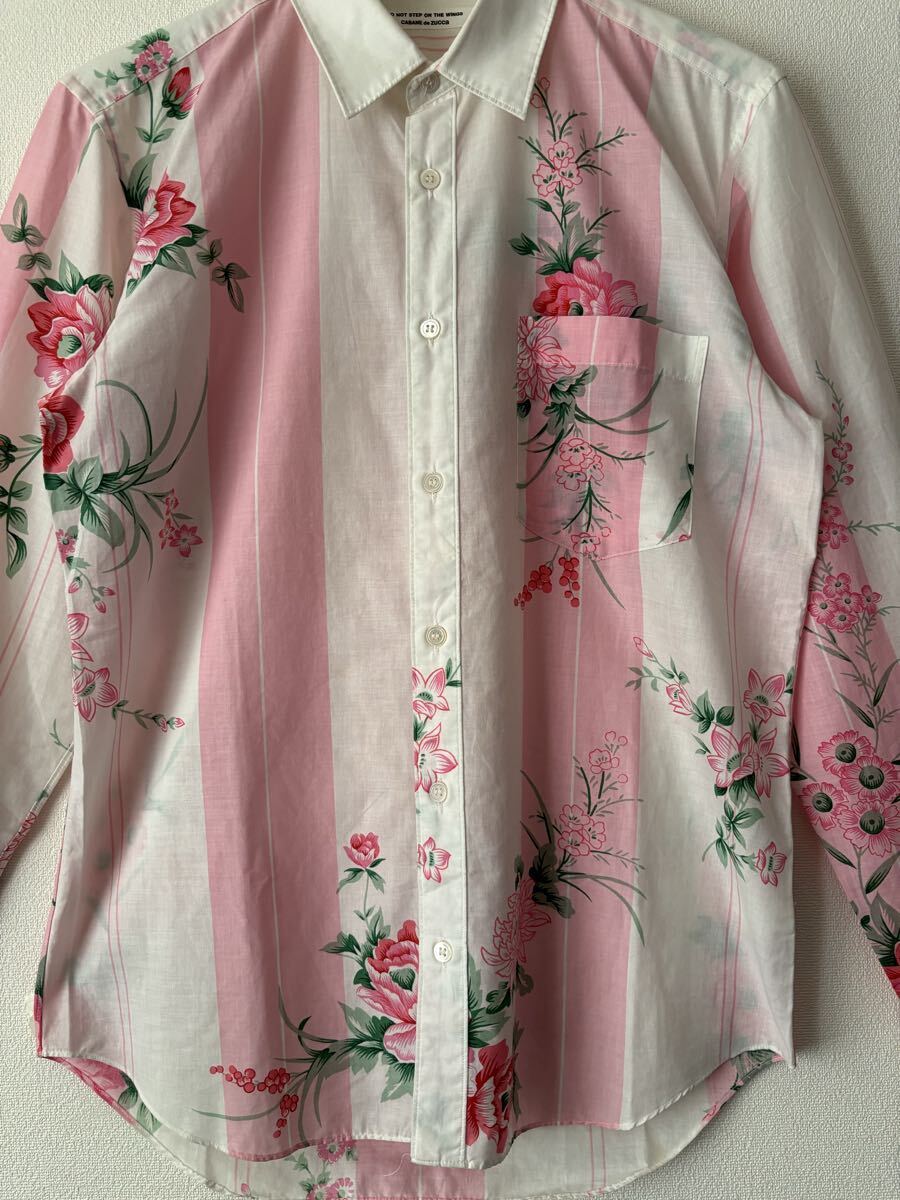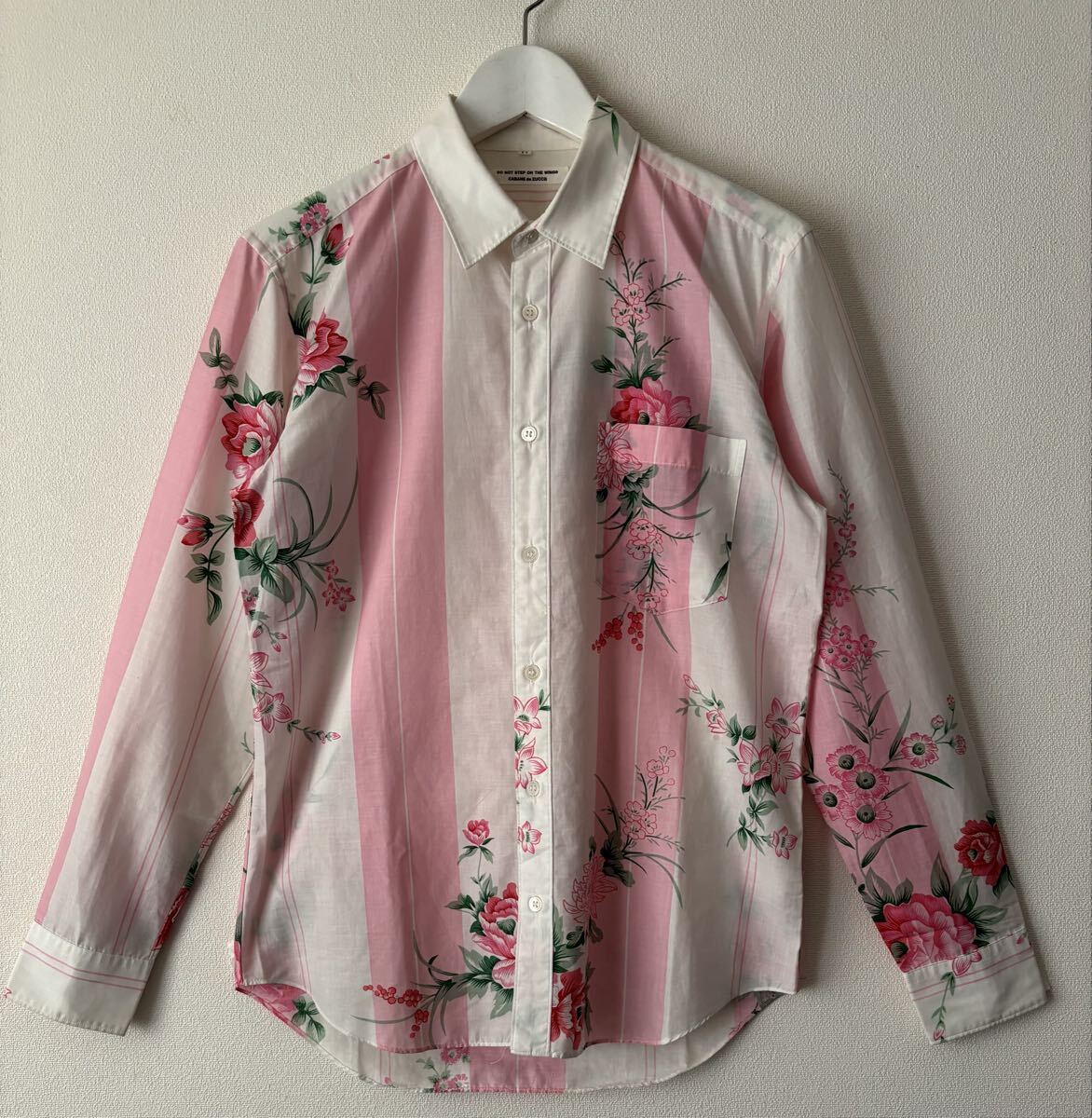 ピンクと白のストライプに花柄プリントの長袖シャツ。