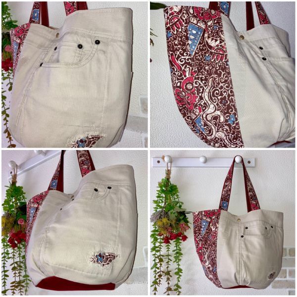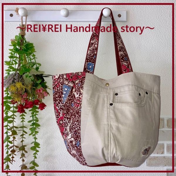 《 れい¥れいのハンドメイド生活 》 ◇ご覧いただきありがとうございます◇ ☆丸底くったりトートバッグ☆リメイクデニム☆パッチワーク☆ 《 商品説明・サイズ 》 リメイクデニムとボルドーカラーのパッチワーク 丸底くったりトートバッグシンプルデザインです ダメージはそのまま使用してます こちらのバッグは自立しません 柔らかく軽い仕上がりです 横上部42㎝ たて30㎝ マチ丸底直径19㎝ 持ち手50㎝ 表ポケット3個 内ポケット1個 マグネット釦付き バッグの重さ 約240g 《 素材 》 ☆表地 綿100%(USEDデニム)他 ☆内布 綿100% ★デニムはUSEDの為ダメージがあります 《 お支払い方法 》
