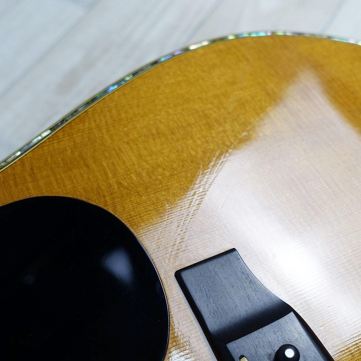 ゴールドパーツに指板のインレイ・ボディトップのロゼッタ&パーフリングにアバロン貝を使用。