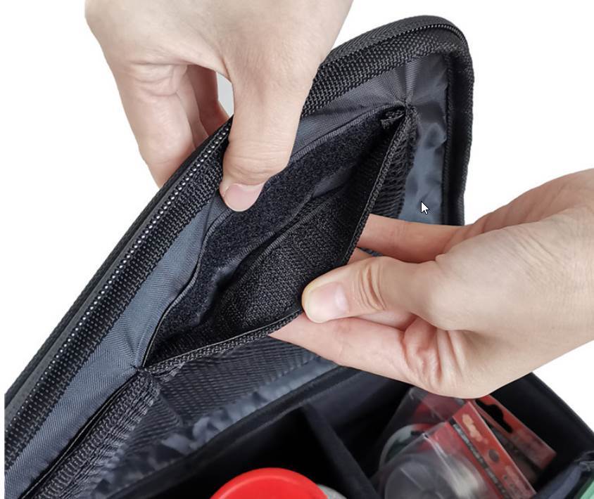 バッグ内部の空間を仕切板は、縦に使用する長めが2枚、横に使用する短めが3枚付属しています。 板はしなやかなナイロン素材の布で覆われているので、大切なリールを持ち運びや落下の衝撃なら保護することが出来ます。 仕切り用の板それぞれの端には、マジックテープが施されているので、仕切り板をバッグ内部壁面のマジックテープにお好みの位置で取り付けることができます。 リールの大きさによって仕切りの位置の細やかな調節が可能。