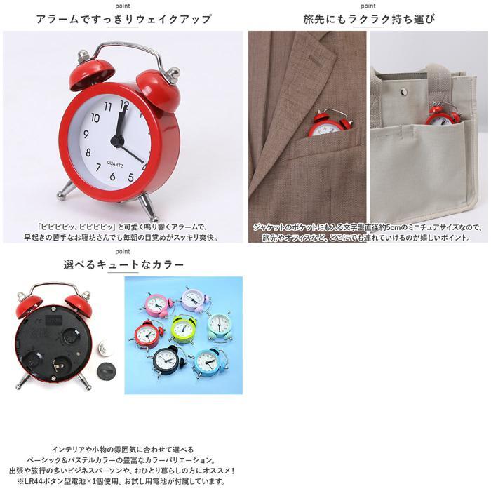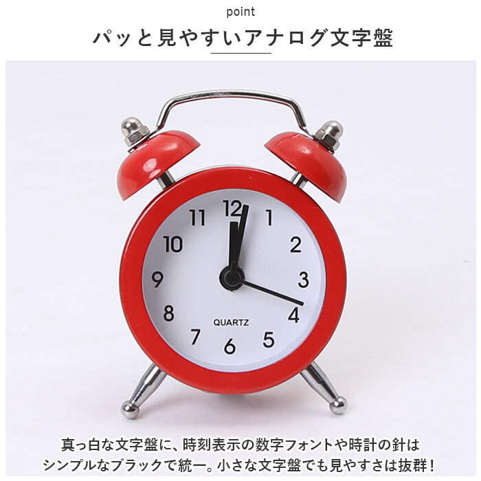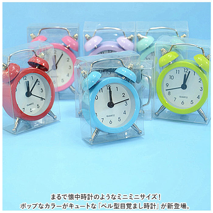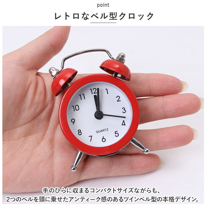 | 商品説明 | ・・まるで懐中時計のようなミニミニサイズ!ポップなカラーがキュートな「ベル型目覚まし時計」が新登場。 ・【レトロなベル型クロック】 ・手のひらに収まるコンパクトサイズながらも、2つのベルを頭に乗せたアンティーク感のあるツインベル型の本格デザイン。 ・【パッと見やすいアナログ文字盤】 ・真っ白な文字盤に、時刻表示の数字フォントや時計の針はシンプルなブラックで統一。小さな文字盤でも見やすさは抜群! ・【アラームですっきりウェイクアップ】 ・・「ピピピピッ、ピピピピッ」と可愛く鳴り響くアラームで、早起きの苦手なお寝坊さんでも毎朝の目覚めがスッキリ爽快。(※アラーム時刻設定用の目盛りは12分単位になります。アラーム設定をする際にお気をつけください。) ・【旅先にもラクラク持ち運び】 ・カバンやジャケットのポケットにも入る文字盤直径約5cmのミニチュアサイズなので、旅先やオフィスなど、どこにでも連れていけるのが嬉しいポイント。 ・【選べるキュートなカラー】 ・インテリアや小物の雰囲気に合わせて選べるベーシック&パステルカラーの豊富なカラーバリエーション。出張や旅行の多いビジネスパーソンや、おひとり暮らしの方にオススメ!(※LR44ボタン型電池×1個使用。お試し用電池が付属しています。) |