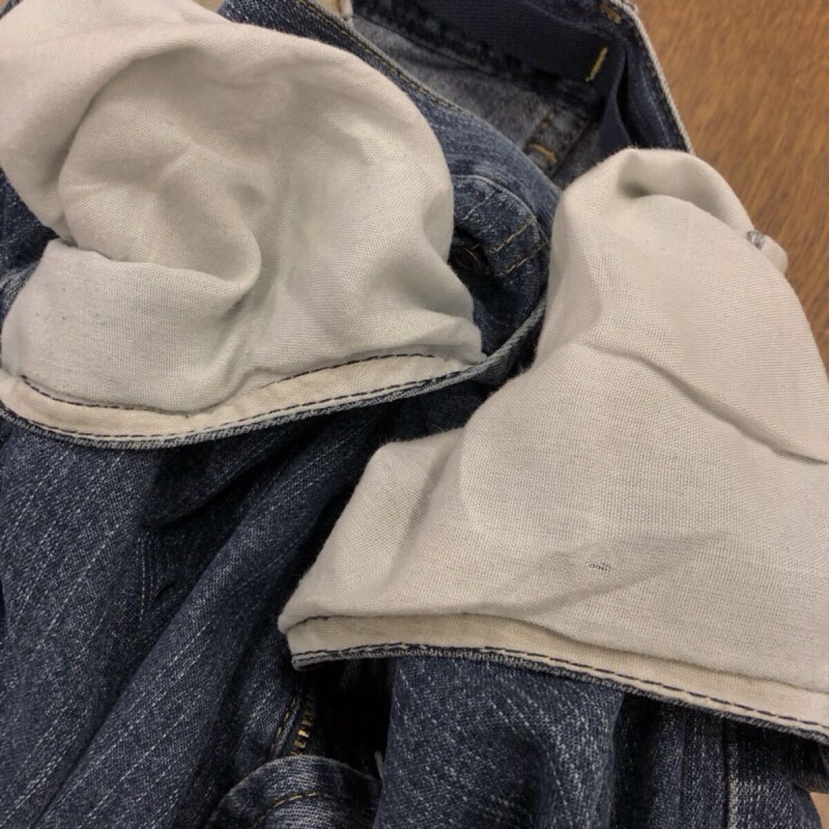 ●ウエスト→フロントボタンやジップは閉じ、ウエストの表中心と後ろ中心を合わせて机や床など平面な場所に置き、フラットに測れるよう生地を軽く手で押さえ、平置きしたパンツの左右端の最上部を計測、実寸した数値×2の表記をしてます。