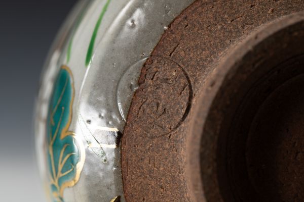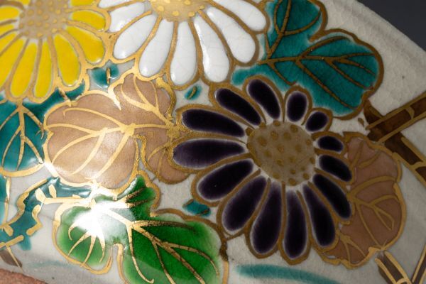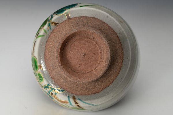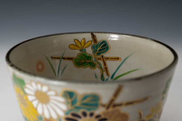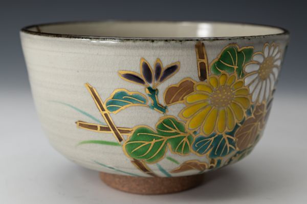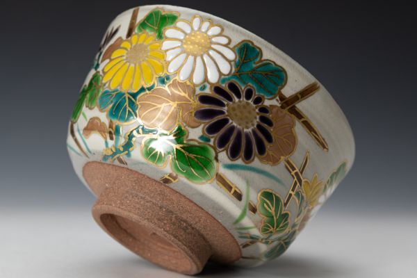 鼠色の釉薬の上に、金彩色絵で優美に菊の絵付けがされている気品ある一碗です。
