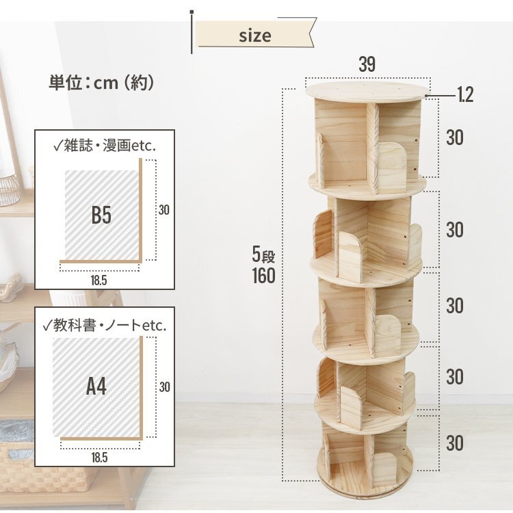 \4面収納で大容量/ 本やCDの収納にお困りの方におすすめな、木製の回転本棚です。 〇商品の特徴 ・360度回転ができ、どこからでも出し入れ可能 ・コンパクトだけど大容量に収納 ・お子さまも安心安全な角丸設計 シンプルなデザインだから、リビングや子供部屋、寝室など様々な場所で大活躍します。。 【商品仕様】 タイプ:5段 カラー:ナチュラル木目調 サイズ:(約)直径39cm×160cm 重量:(約)15.6kg 耐荷重:約10㎏ 素材:パイン材 |