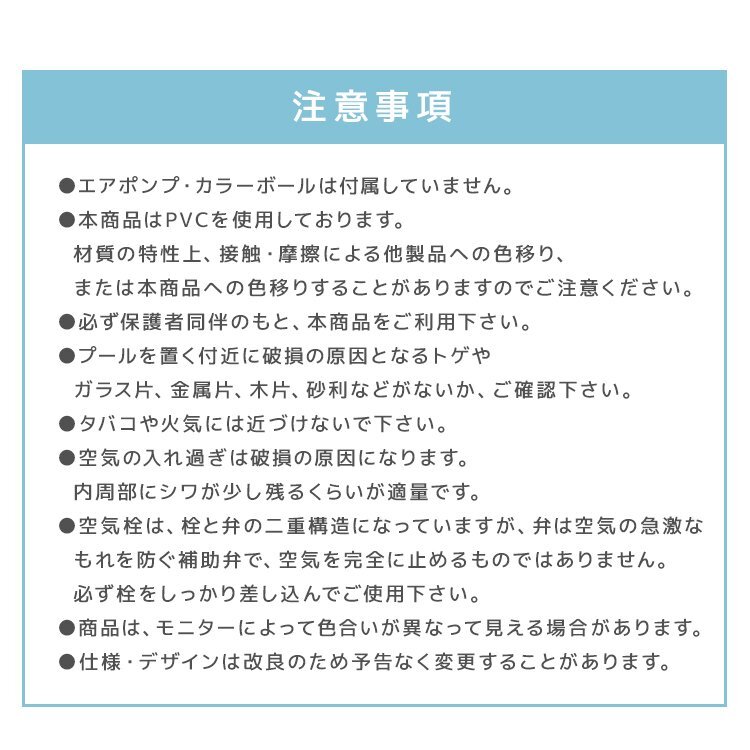 \ 暑い夏は、プールで涼しさを味わいませんか♪ / 小さなプールでは物足りない・・・ そんな方にもご満足いただける、約2メートルのファミリープールです。 子どもも大人も家族みんなで楽しめるBIGサイズ! 大人が脚を伸ばしても悠々くつろげるゆったり感! 子どもなら泳げちゃうくらい広々としています。 背もたれ付きのデザインで、くつろぎながらお子さまの様子を見守ることができます♪ 今年の夏は家族みんなでおうちプールを楽しもう! 【商品コード】 GAC007CS 【商品詳細】 カラー:カラースプレー サイズ(約):幅200×奥行き150×高さ46cm 重量(約):2.68kg 素材:PVC(ポリ塩化ビニール) 【注意事項】 ・エアポンプは付属していません。 ・本商品はPVCを使用しております。材質の特性上、接触・摩擦による他製品への色移りまたは本商品への色移りすることがありますのでご注意ください。 ・必ず保護者同伴のもと、本商品をご利用下さい。 ・本品は水深が深くなるため、対象年齢未満のお子様は使用しないで下さい。 ・プールを置く付近に破損の原因となるトゲやガラス片、金属片、木片、砂利などがないか、ご確認下さい。 ・タバコや火気には近づけないで下さい。 ・空気の入れ過ぎは破損の原因になります。内周部にシワが少し残るくらいが適量です。 ・空気栓は栓と弁の二重構造になっていますが、弁は空気の急激なもれを防ぐ補助弁で、空気を完全に止めるものではありません。 必ず栓をしっかり差し込んでご使用下さい。 ・プールは安定した平らな場所でご使用下さい。傾斜のある場所、タイル・煉瓦など目地や段差のある場所でのご使用は変形・破損の原因になりますので避けて下さい。 また、表面に塗装・コーティング等の処理された場所でのご使用は塗装等が変色したりプール本体に色移りすることがあります。ご注意下さい。 ・商品は、モニターによって色合いが異なって見える場合があります。 ・仕様・デザインは改良のため予告なく変更することがあります。 【もちろん新品未使用品です】 |
