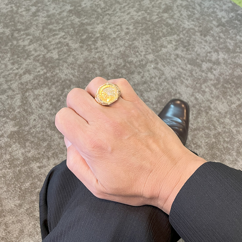 コメント | インディアンヘッド 2.5ドル金貨にダイヤモンド 0.67ctをセッティングしたメンズリングが入荷致しました。金貨の表面にオールド・インディアン、裏面はアメリカ合衆国を象徴するハクトウワシが描かれています。インディアンの髪飾りとリングサイドに良質で無色透明に近いダイヤがセットされておりイエローゴールドをさらに輝かして豪華な装いにしてくれます。 ~出品担当の山本より~ 希少価値の高いコインを使ったリングです。装着すると重厚感が有り、着け心地はなめらかです。カジュアルな服装にも合わせやすいので普段使いにもお勧めの一品です。 | ||