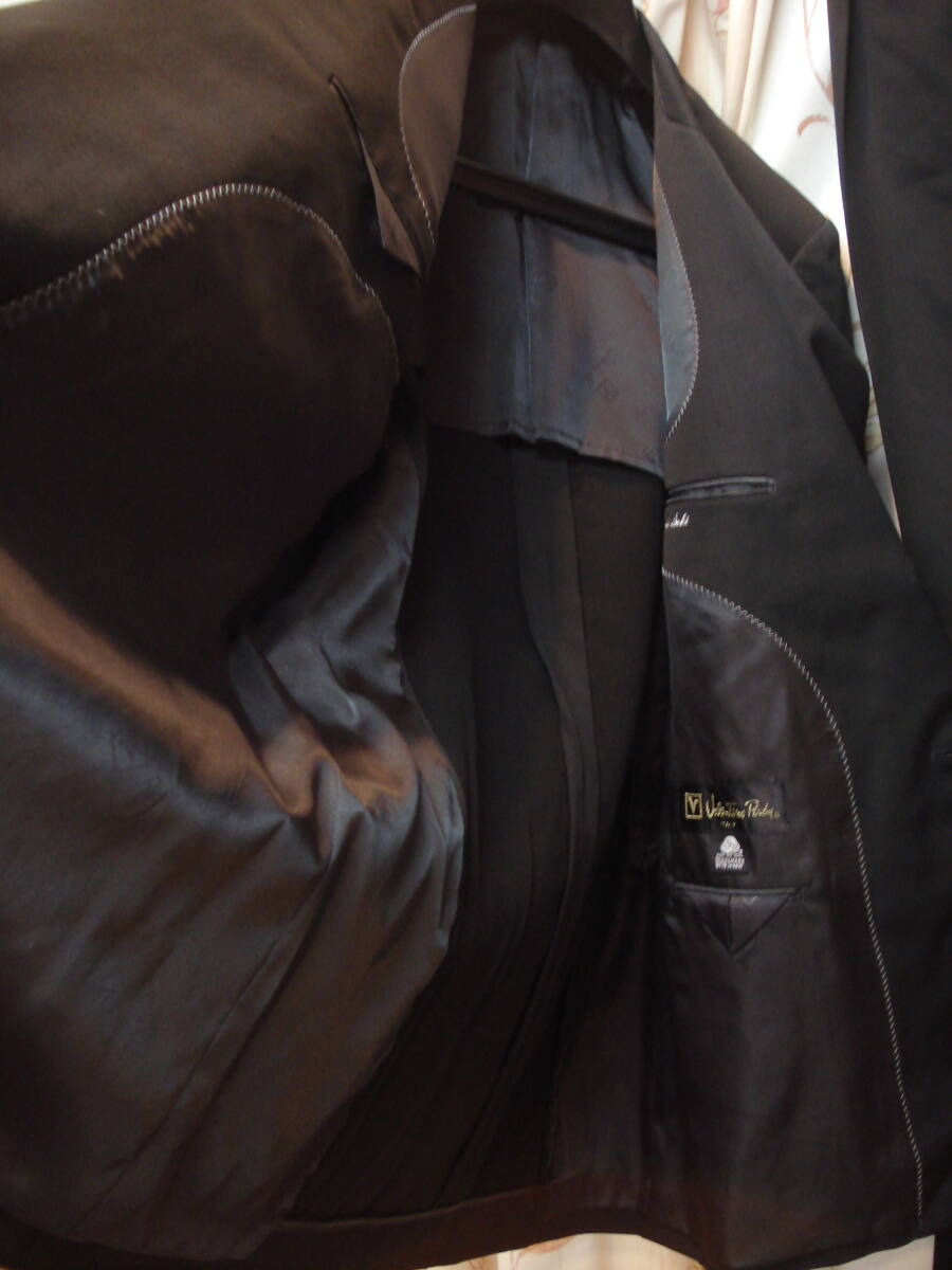 送料無料!美品!秋・冬もの!大きな人用!A8サイズ!ウェスト:87cm~96cm!アジャスターにて調節対応可能!黒色!ブラックフォーマル色!ウール:100%!定番ブラックフォーマルダブルスーツ!です。。色は、とても高級感あるオシャレな、「黒色!ブラックフォーマル色!」の、秋・冬もの!A8サイズ!大きな人用!ウェスト:87cm~96cm!アジャスターにて調節対応可能!黒色!ブラックフォーマル色!ウール:100%!定番ブラックフォーマルダブルスーツ!です。表示サイズは、「A8サイズ!」で、「身長:185cm・胸囲:98cm」で、素人寸サイズは、約「肩幅:49cm・着丈:82cm・袖丈:65cm・脇下幅:62cm・ウェスト:87cm~96cm!アジャスターにて調節対応可能!・股下:81cm・ズボン裾幅:24.5cm」です。股下寸法:81cmですが、折り返し部が、約9cmありますので、最大股下寸法:約88cm位まで可能です。。ウェスト部の生地の余生地が、約7cmありますので、あと約5cm位はウェストを出す事が可能です。ズボンのタックは、片側1タックの合計2タックです。ベントとは上着の背面下部の切れ目の事です。何もありませんので、「ノーベント!」です。上着の背中裏地は、「背抜き!」です。素材は、「ウール:100%」です。。