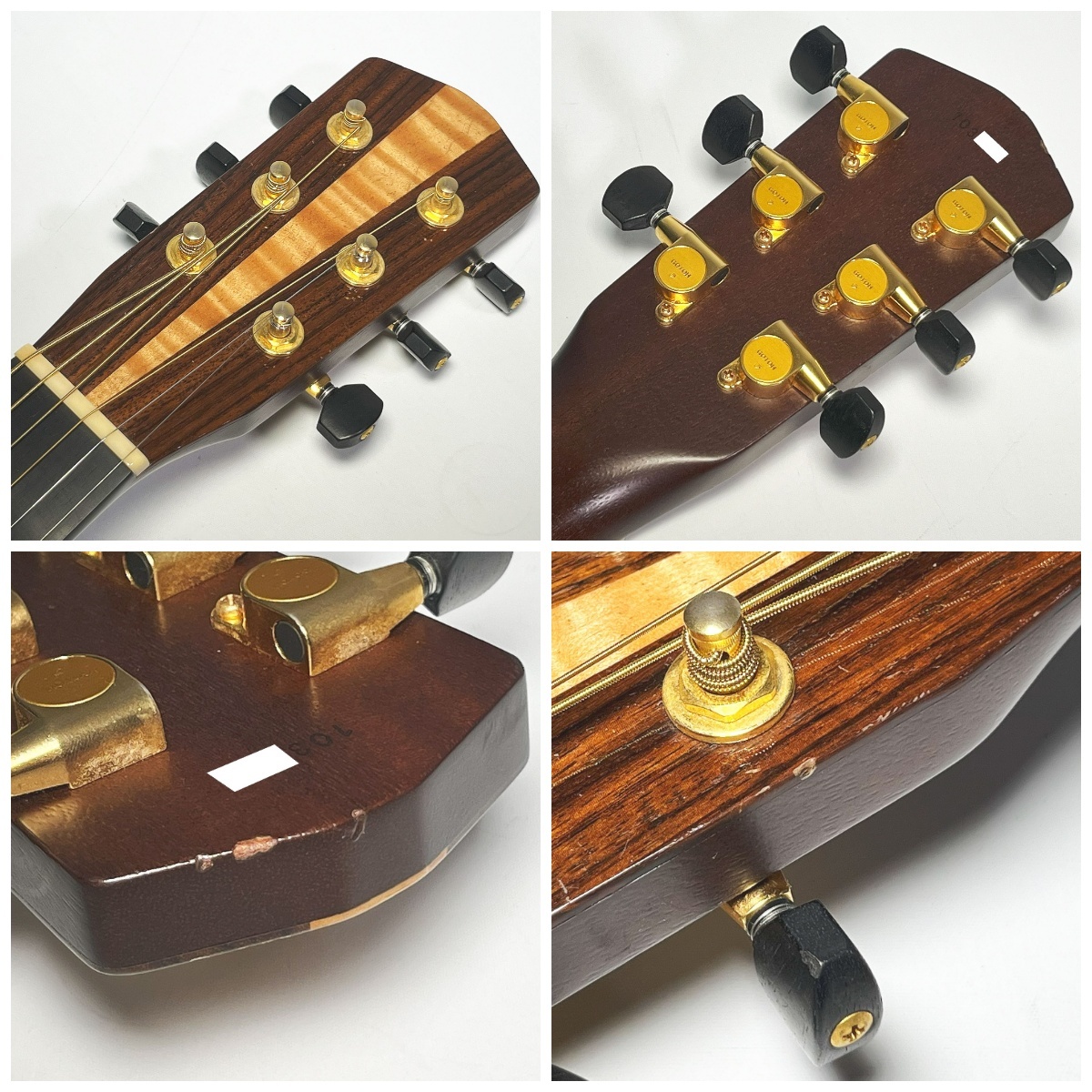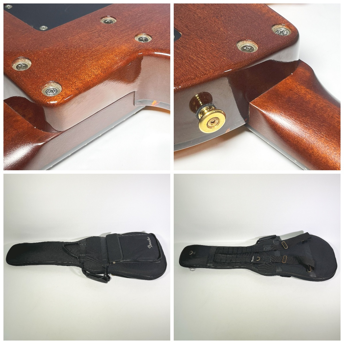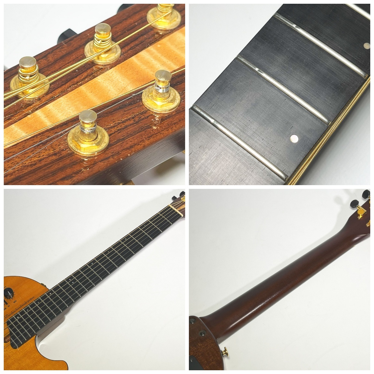 | ●ネックストレート ●トラスロッド右方向90度程度余裕あり。 左180度以上余裕あり ●ナット幅45mm ●スケール625mm ●フレット5〜6割程 (2弦の3〜10フレットに押弦によるすり減りありますが、サスティーン、チョーキング問題ございませんでした) ●弦高12F 6弦2.5mm 1弦1.5mm ●ボディ厚み50mm ●重量2392g |