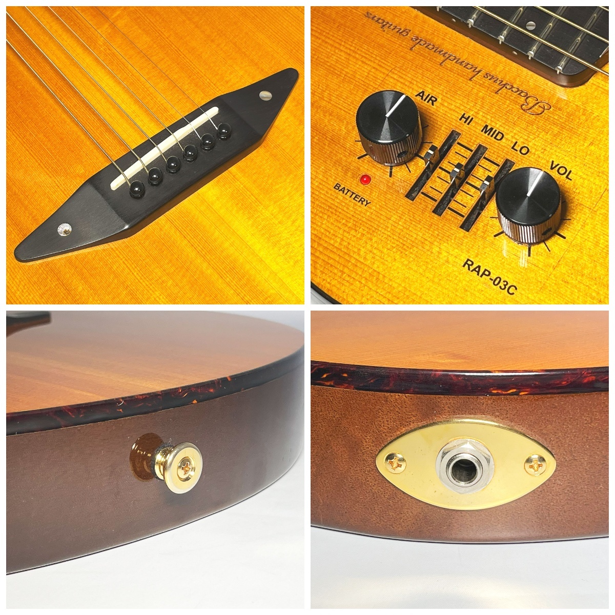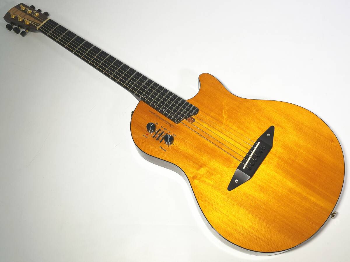 | バッカスより、ピエゾピックアップとコンデンサーマイクの2系統のピックアップからなるコンパクト・エレアコ『SPACE STEEL CN-NB』が入荷致しました! ファクトリーが誇るギターマエストロ百瀬泰夫氏の長年のアコースティック製作の経験から生み出された独自のブレーシング構造を持ち、ハウリングを抑えたイージーな操作性を維持しつつも、十分な手応えのある生鳴りを両立! このタイプでは実現の難しかった豊なダイナミクスレンジを引き出しています! 生鳴りを忠実にアンプに伝えるピエゾピックアップと、コンデンサーマイクによるデュアルピックアップをコントロールするRAP-03Cシステムを搭載しており、 ギター本体に内蔵された3バンドEQ、コンデンサーマイクの出力を設定するAIRコントロールで、 幅広い音作りと、演奏中のスムーズなイコライジングを実現! アコースティックギターのよさを継承しつつも、ソリッドボディでは得ることのできない 広がりのあるふくよかなサウンドながらも芯の通ったしっかりとしたサウンドです! 【商品詳細】 ●BODY TOP : SPRUCE ●BODY BACK : MAHOGANY (HOLLOW) ●NECK : MAHOGANY ●FINGERBOARD : EBONY ●TUNER : GOTOH SG360-EN07 ●PICKUPS & PREAMPS : HMC REAL ACOUSTIC PREAMP (RAP-03C) ●BRIDGE : EBONY ●FINISH : THIN LACQUER NB-FINISH |