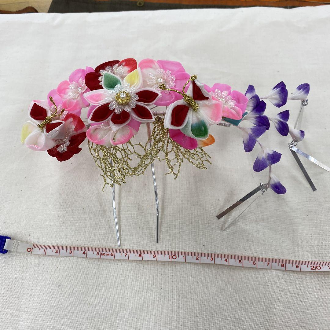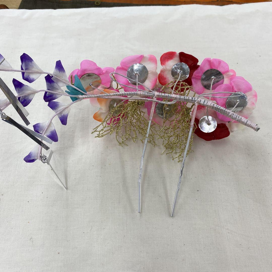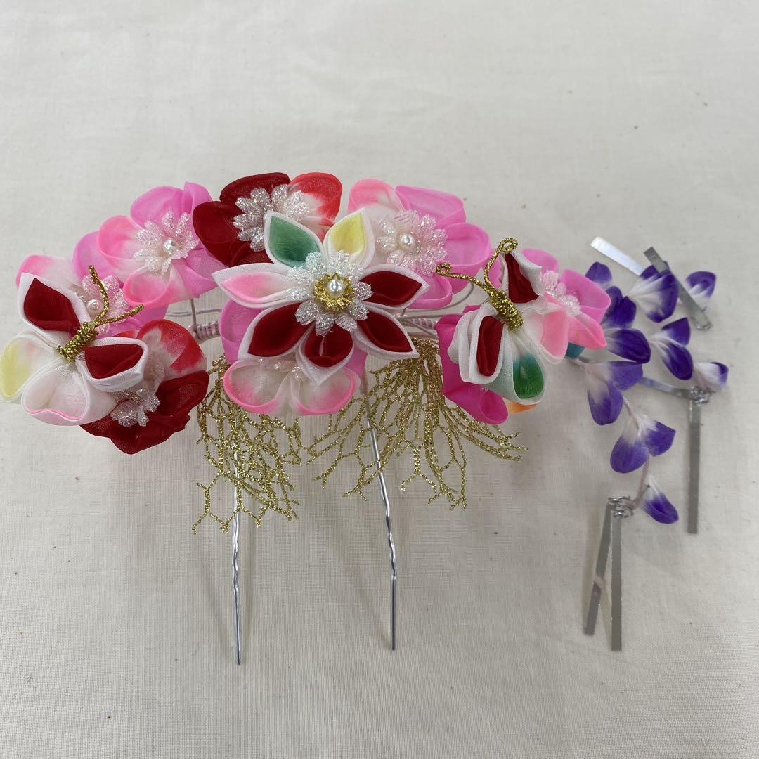 華やかな花と蝶のデザインの髪飾り、七五三や特別な行事に最適です。