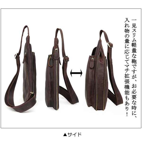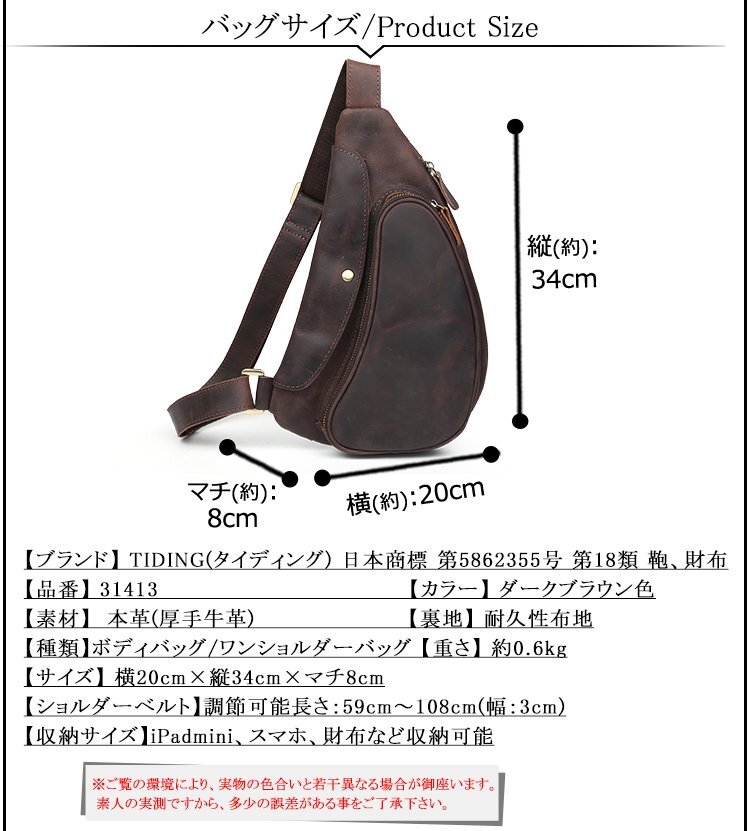 TIDING マチ拡張 本革 メンズ ワンショルダーバッグ ボディバッグ 厚手牛革 プルアップレザー 経年変化 iPadmini対応 自転車鞄 潮牛