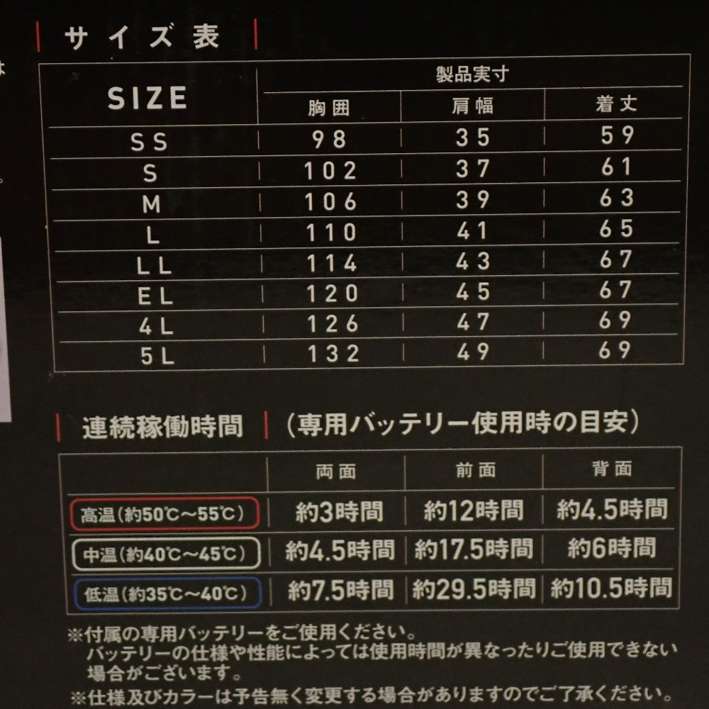商品説明 | モバイルバッテリー10 000mAhを使用し、発熱体9個を搭載した電熱ベスト。前部分は両脇ポケットに2個、後ろ部分は後衿に1個、両肩に2個、背中中央に2個、腰部分に2個の計9個搭載。 連続稼働時間は高温(赤)約50℃〜55℃:両面使用時約3時間 中温(白)約40℃〜45℃:両面使用時約5時間 低温(青)約35℃〜40℃:両面使用時約7時間 | |