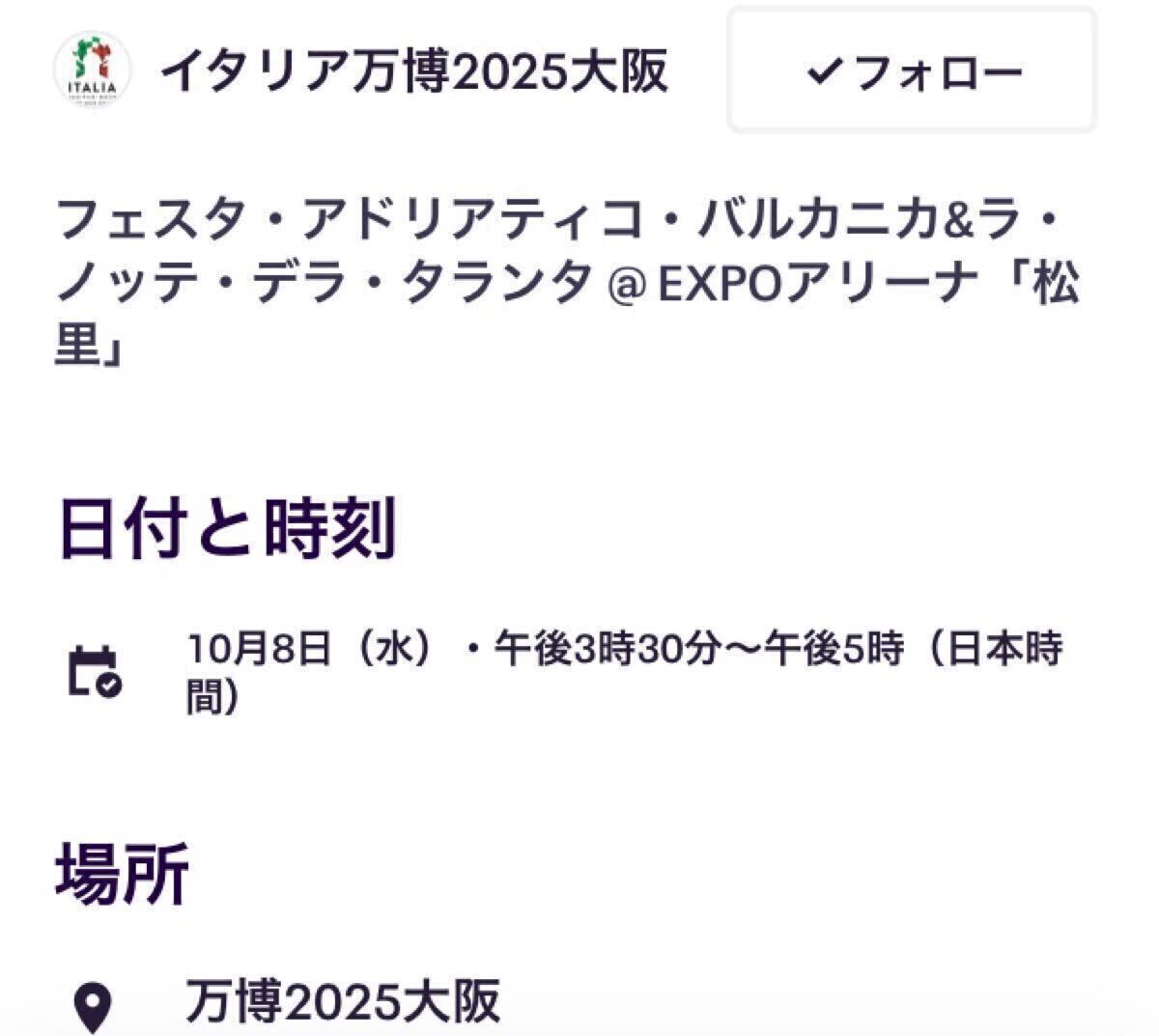 10月8日(水)イタリア館イベント フェスタアドリアティコバルカニカ & ラノッテデラタランタ チケット 大阪関西万博 Matsuri