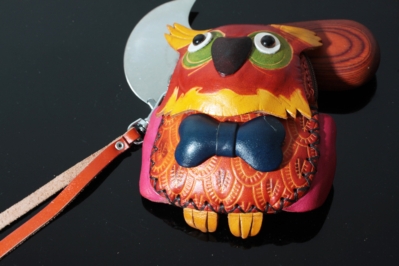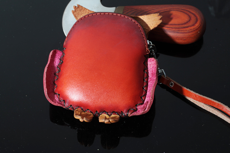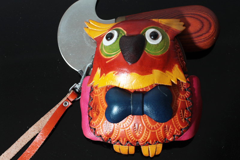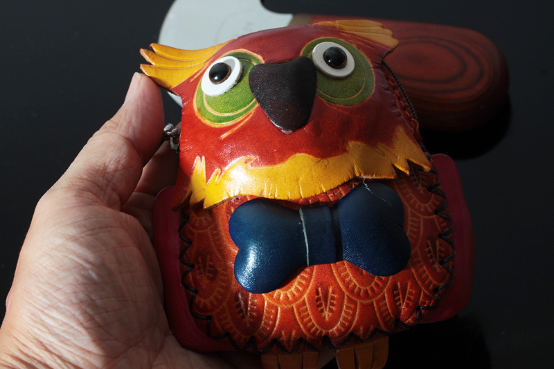 手作り限定1点小銭入れ牛革 フクロウ蝶ブルーネクタイ