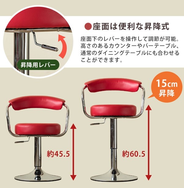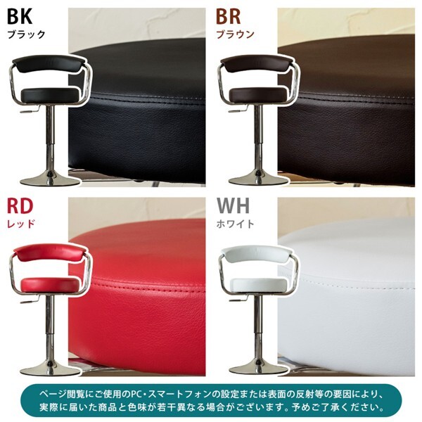 ※現在ご覧の商品ページはレッドのご購入ページとなります。 ヤフオクの仕様上単一ページに複数バリエーションを掲載することができませんので、他バリエーションが希望の場合は別ページでご購入お願い致します。 配達業者を指定いただくことはできません。 沖縄県・離島配送不可となります。 Joel ダイニングバーチェアです 丸型座面に腰を包み込むような背もたれのデザインです レバー操作で昇降出来ます 座面は360度回転します(固定出来ません) 張り材はお手入れし易いPVCレザーです ブラック(BK)、ブラウン(BR)、レッド(RD)、ホワイト(WH)の4色展開です。 タイミングによっては在庫切れの場合があります。