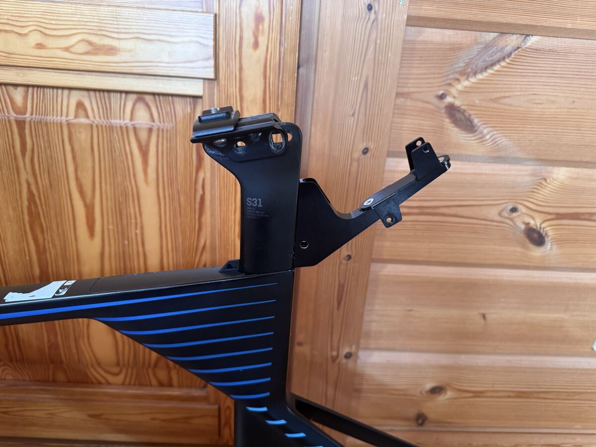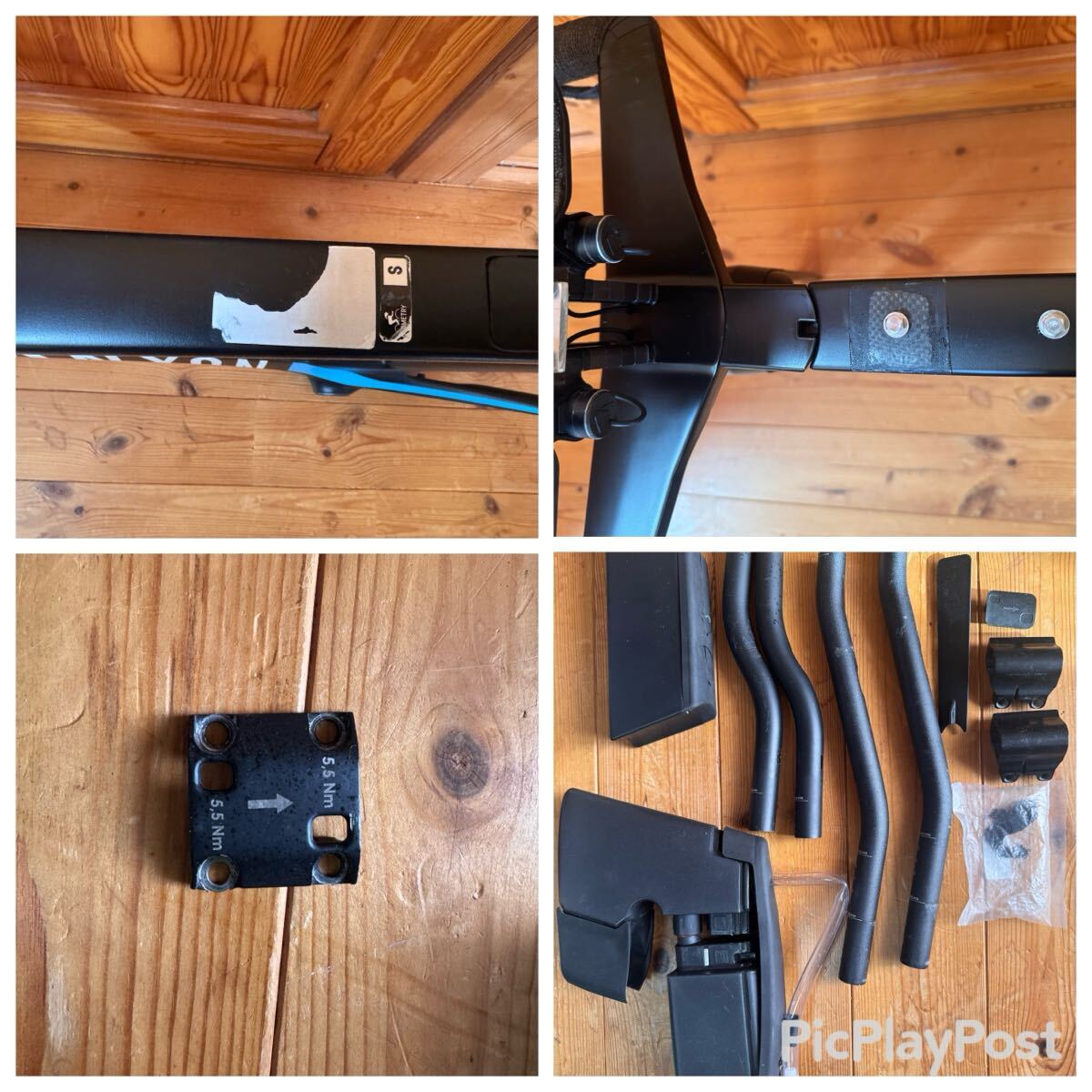 トップチューブバックの取り付けネジが破損しフレーム側の穴がナットリベットが効かなくなった為補修してあります。クラックはありません。見た目気にされる様なら検討やめた方が良いかと思います。ハンドルブリッジの固定プレートのボルト穴が変形した為アルミ板を加工して付けてます。写真5と8で8が本来のプレートです。ハイドレーションタンク上部のカバーがこのプレートの厚みでピッタリとハマらないです。今迄使ってたので問題はないですが少々浮き上がります。ハンドル・BB・Di2ケーブル・バッテリー・シートポスト付属