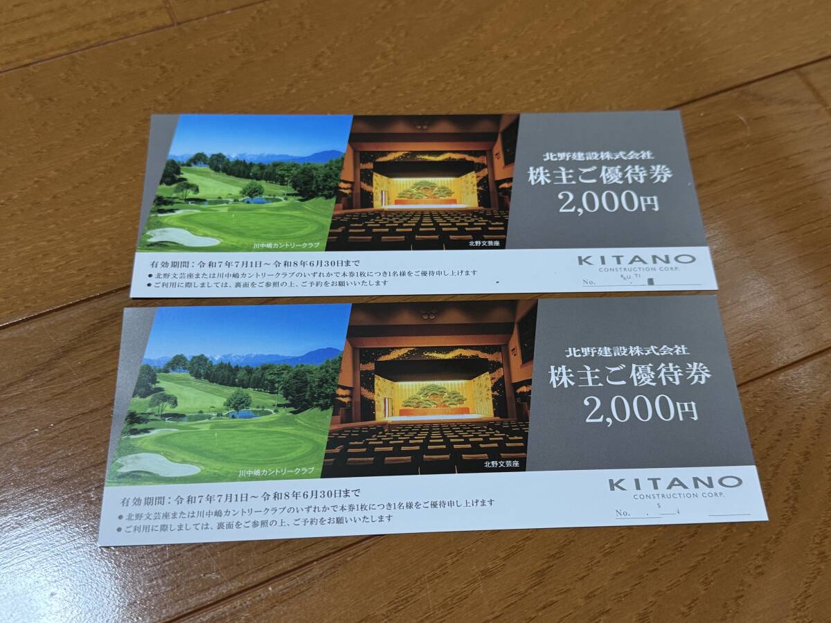 北野建設の株主優待券4,000円分(2000円×2)です ○ 有効期限は2026/6/30 ○ 川中嶋カントリークラブまたは北野文芸座にて使用できます ○ クリックポストで発送の予定です ○ 送料は当方で負担させて頂きます