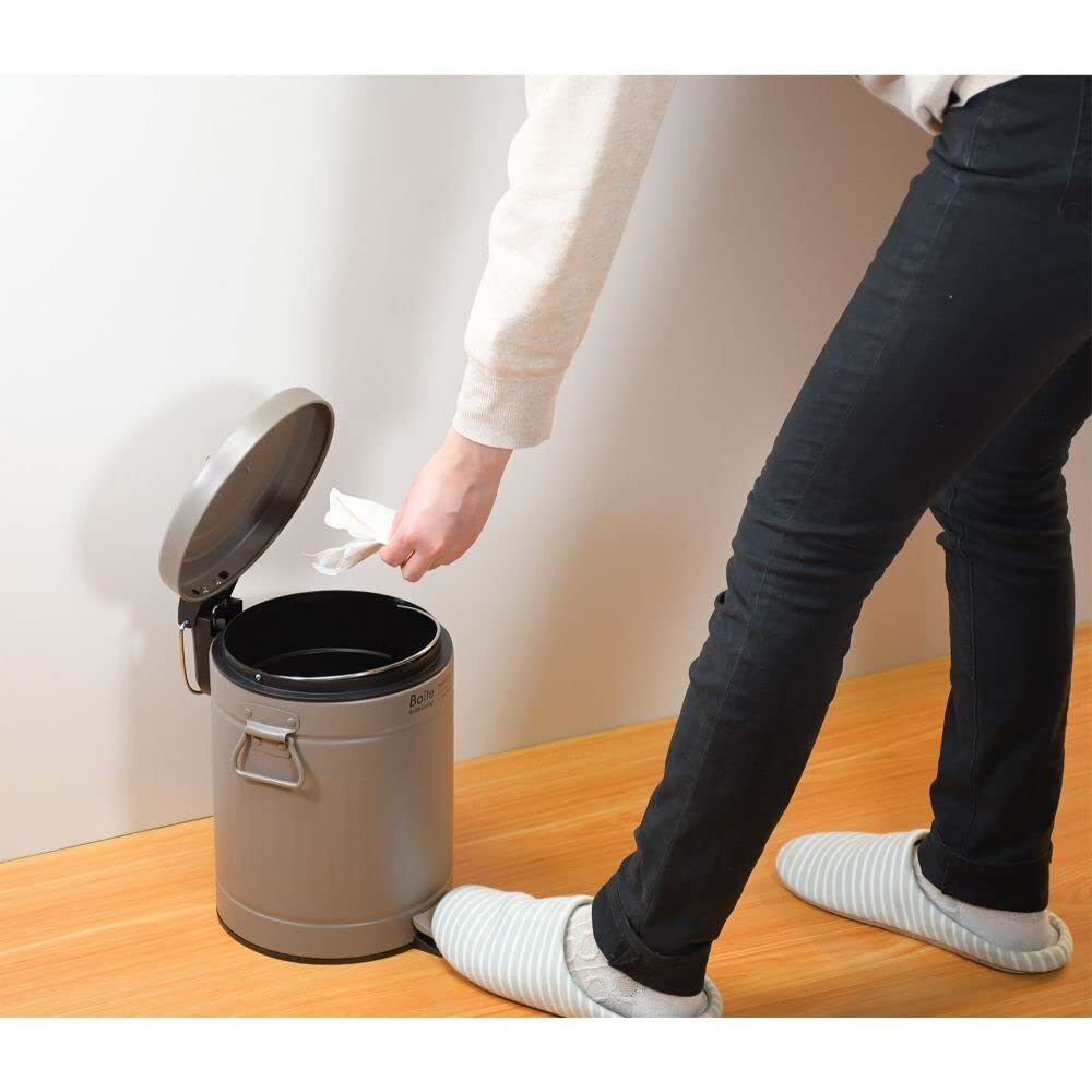 蓋がゆっくり閉まる静音設計のトラッシュカン。 手を汚さずに開けられる、便利なペダル開閉式。 蓋がゆっくり閉まる静音設計。 中子は取り出しやすい持ち手付仕様。