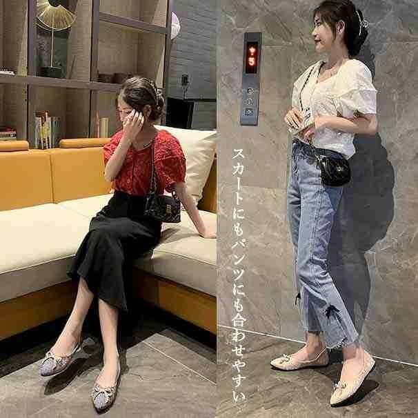 レディース パンプス フラットヒール 歩きやすい リボン バックル ソフト 高級感 38 ベージュ