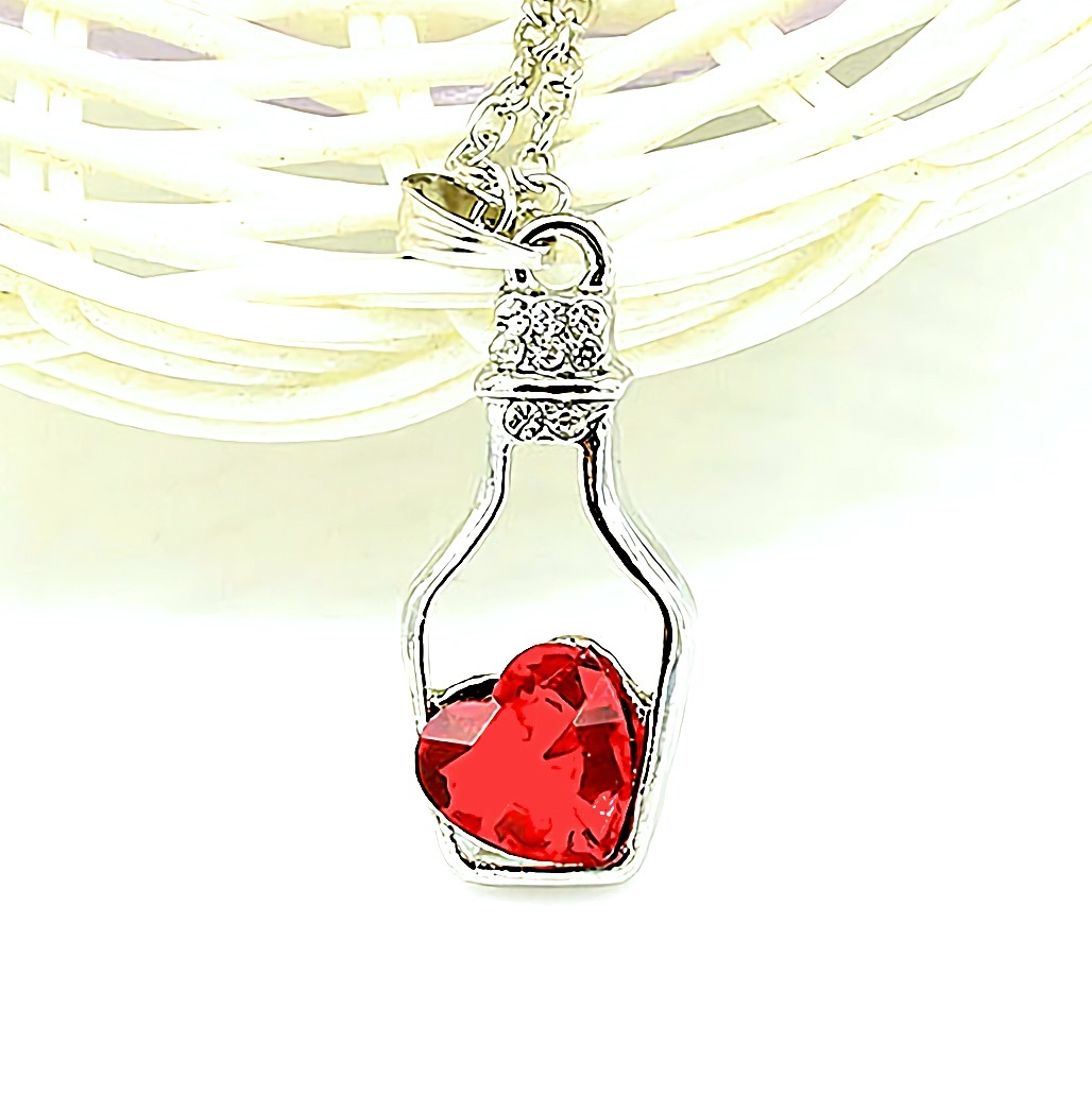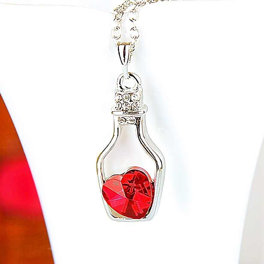 赤く輝く宝石のような小瓶は、胸元で揺れるたびにルビーレッド色の輝きを振りまきます。
