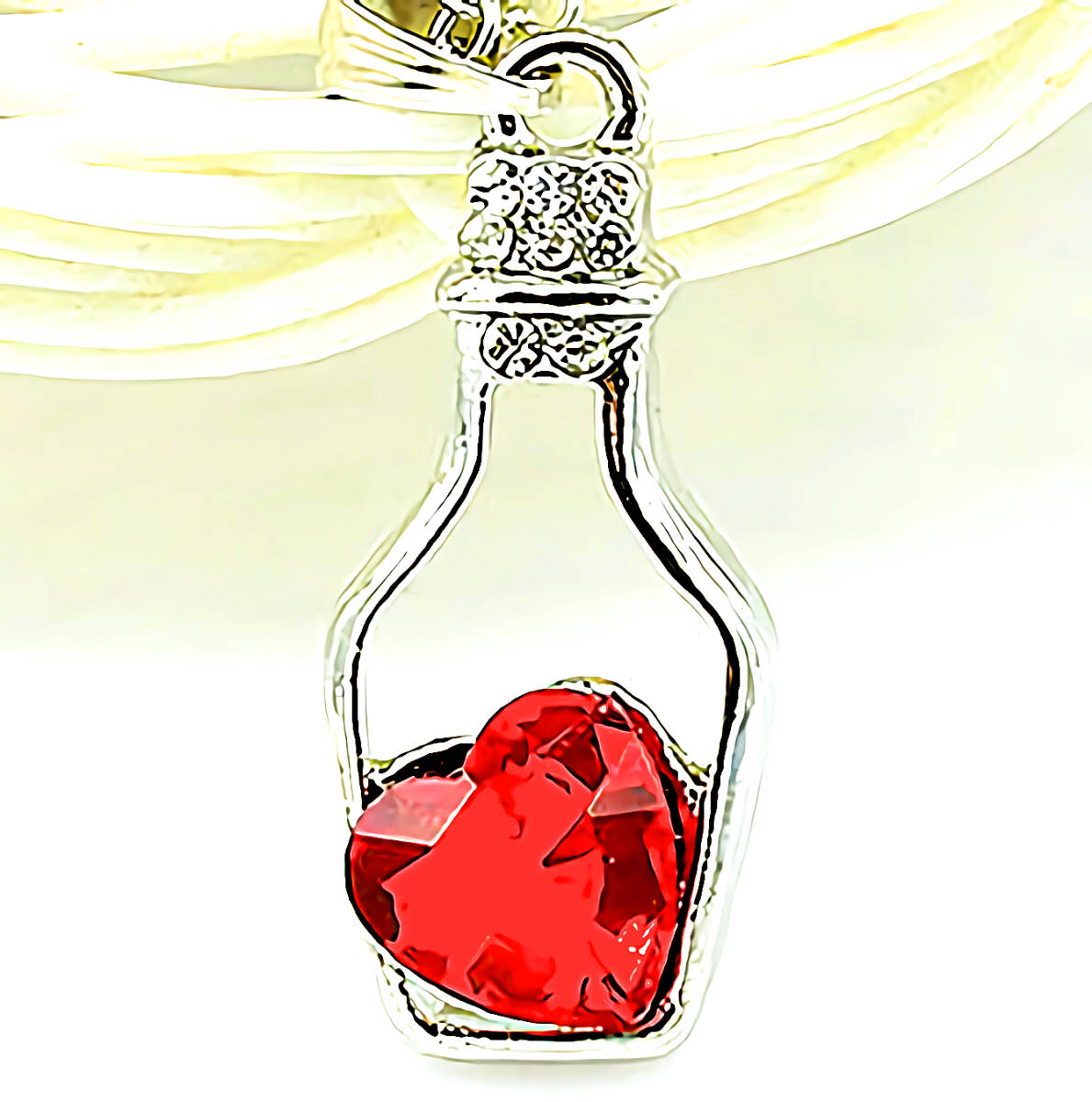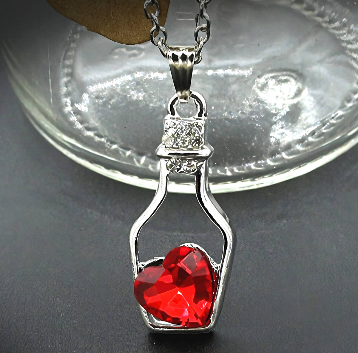 こちらハートのレッドルビーが可愛いハートの小瓶プラチナ仕上げ925シルバーネックレスとなります。
