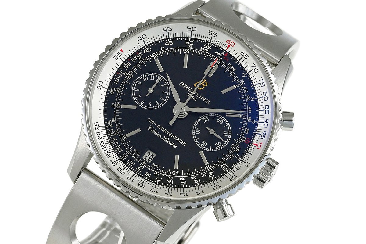 【コメント】 1952年発表以来「腕に装備する計器」として多くのパイロットに愛用され、現在も時計ファンを魅了し続けるブライトリングフラッグシップ・モデル「ナビタイマー」。2009年にブライトリング創業125周年を記念して発売された2009本限定モデルです。クラシカルな2つ目のクロノグラフやこのモデルのために開発されたエアレーサー・ブレスレットが特徴です。ダイアルと裏蓋に「125e ANNIVERSAIRE EDITION LIMITEE」の文字、限定シリアル刻印入りです。9時側ケースサイドやラグのエッジ部分など、使用に伴う多少のキズ・擦りキズがあります。ガラス無反射コーティングに僅かな擦れがあります。2009年8月に国内正規店にて購入品で、オーバーホール歴は分かりませんが、現在精度は平置きで日差+1秒程です。