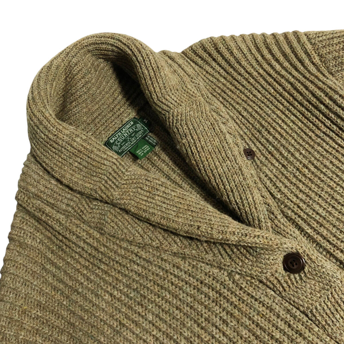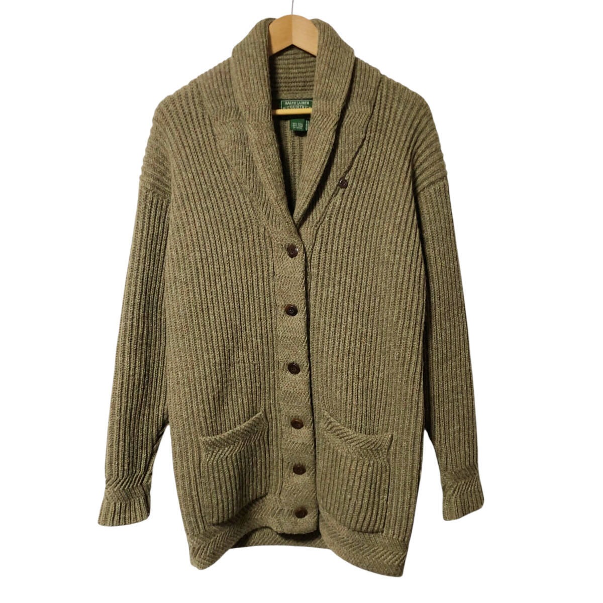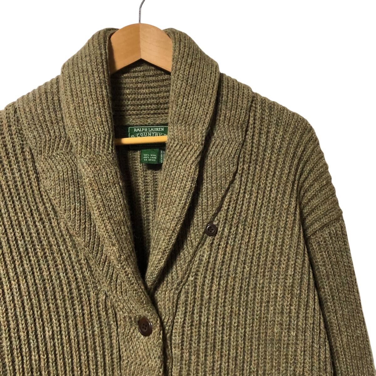90s RALPH LAUREN COUNTRY ラルフローレン カントリー ショール カーディガン ニット ジャケット M グレージュ系 ウール ヴィンテージ OU4