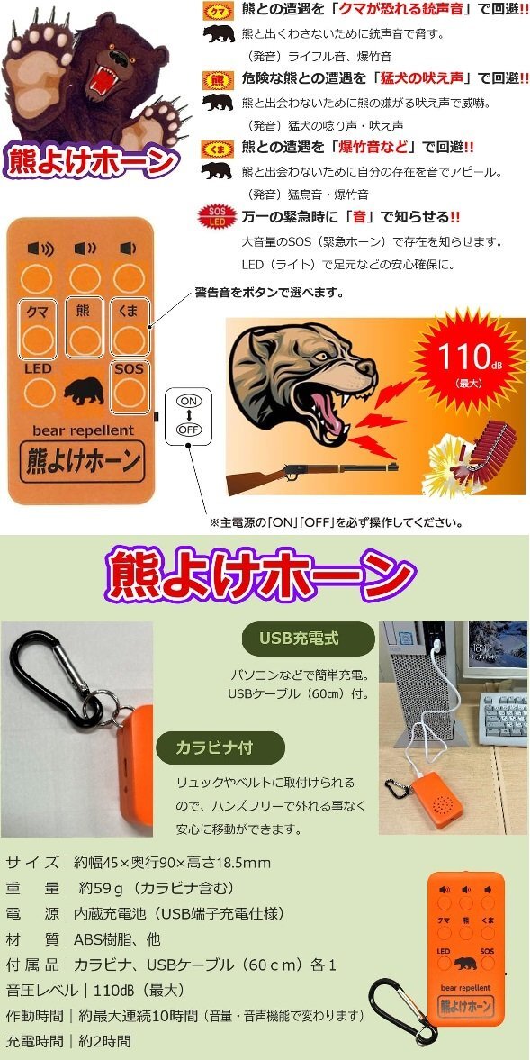 ■危険な熊との遭遇を「音」で回避! 熊との遭遇をクマが恐れる銃声・猛犬の吠え声・爆竹音など最大約110 のホーンで熊を回避! 人の少ない登山道を歩く時や、山菜採り等で立ち止まるときなど、必要な時だけ「ホーン」ボタンをプッシュ。 音声は猟銃・猛犬・爆竹から選べます。 もしものときのSOSホーンと手・足元を照らすLEDライト付。 ■警告音をボタンで選べます 熊との遭遇を「クマが恐れる銃声音」で回避熊とでくわさないために銃声音で脅す。 危険な熊との遭遇を「猛犬の吠え声」で回避熊と出会わないために熊の嫌がる吠え声で威嚇。 熊との遭遇を「爆竹音など」で回避クマと出会わないために、自分の存在を音でアピール。 万一の緊急時に「音」で知らせる大音量のSOS(緊急ホーン)で存在を知らせます。