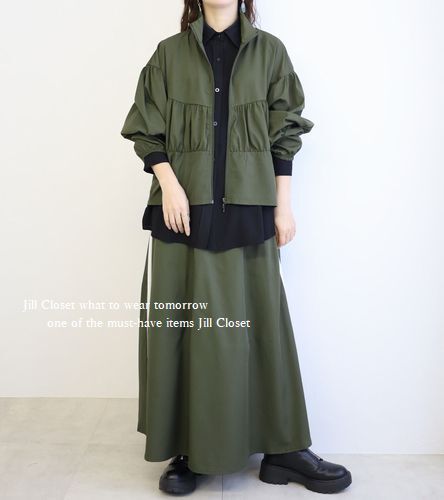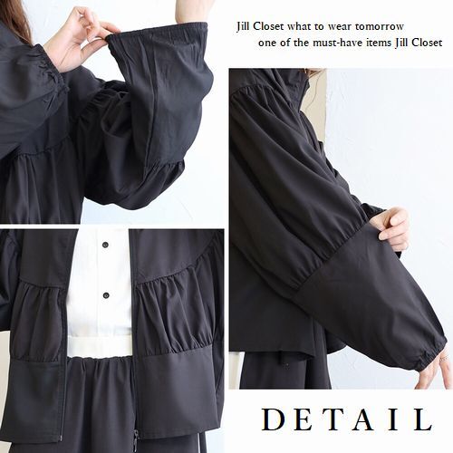 お洒落なスタンド衿&ギャザー・バルーンスリーブジャケット。モード感溢れるクールなデザイン。軽量で柔らかな質感。季節の変わり目・空調対策にも最適です。