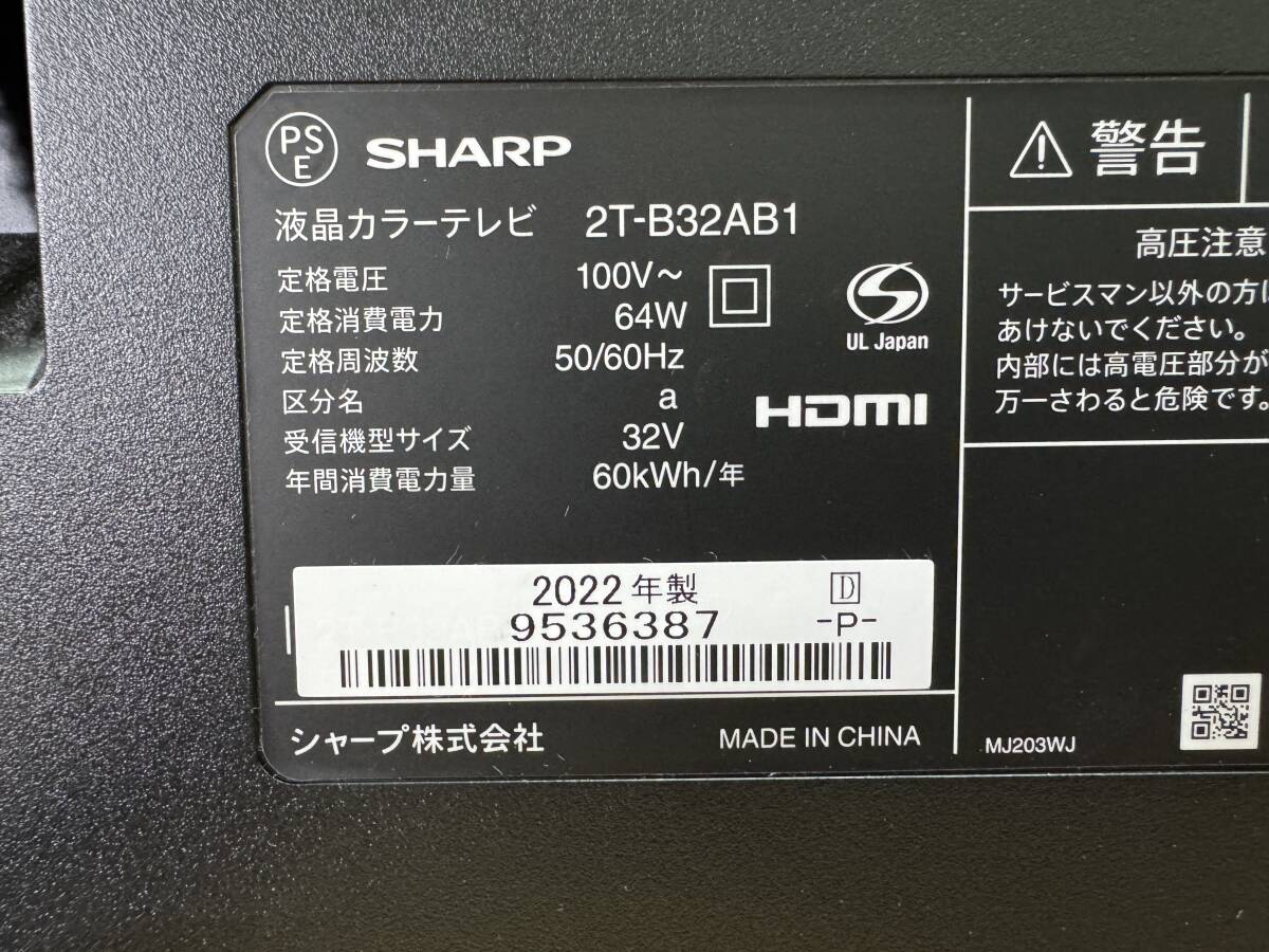 32型 シャープ AQUOS LED 液晶テレビ 2022年製 2T―B32AB1 AQUOS City接続可 ネット動画 u-next DMM 視聴可能 管理F1574