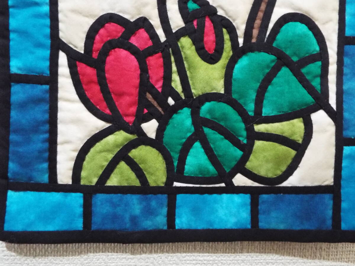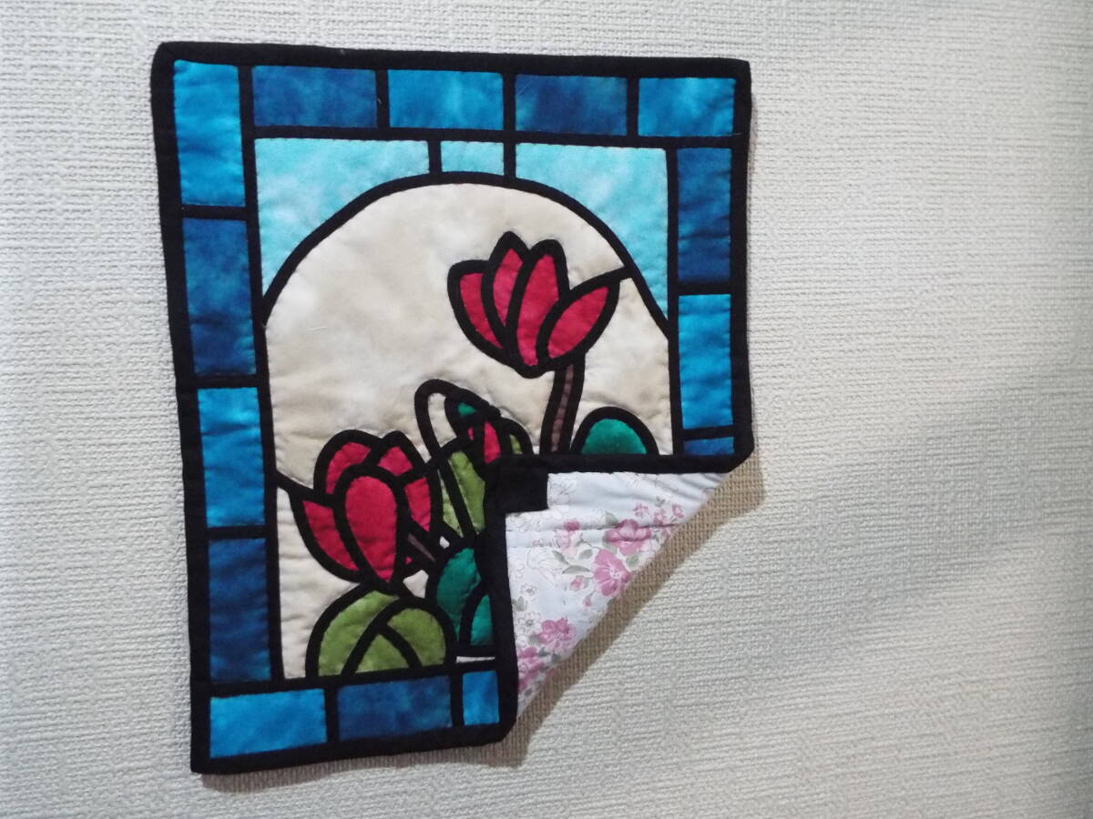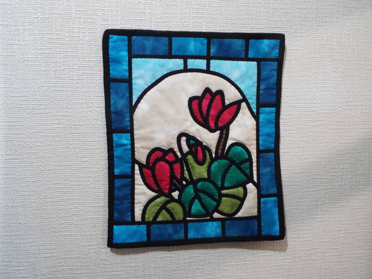 ご覧いただき有難うございます。シクラメンのステンドグラスを作成しました、10月ころからお店に鉢植えのシクラメンが並びます、玄関にいかがですか、全て手縫いで仕上げました、趣味のパッチワークですので、糸のずれとかありますが、ご理解の程宜しくお願いします。素材、むら染め、コットン、キルトしん、バイヤステープ(黒)寸法:縦37cm、横30,5cm