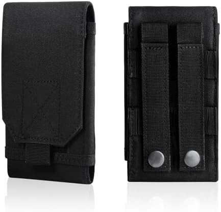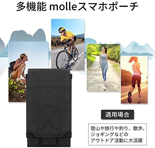 仕様:留め具は粘着的なマジックテープ仕様、サイドは伸縮性があるデザインのおかげで、ケース装着 6.0インチ以内のスマホあるいはほかのサイズ同じぐらいデジタルカメラなどの小物も何でも収納できます。背面にベルトストラップ付きで、Molleモール対応したベルト、ベストに取り付けることができます。