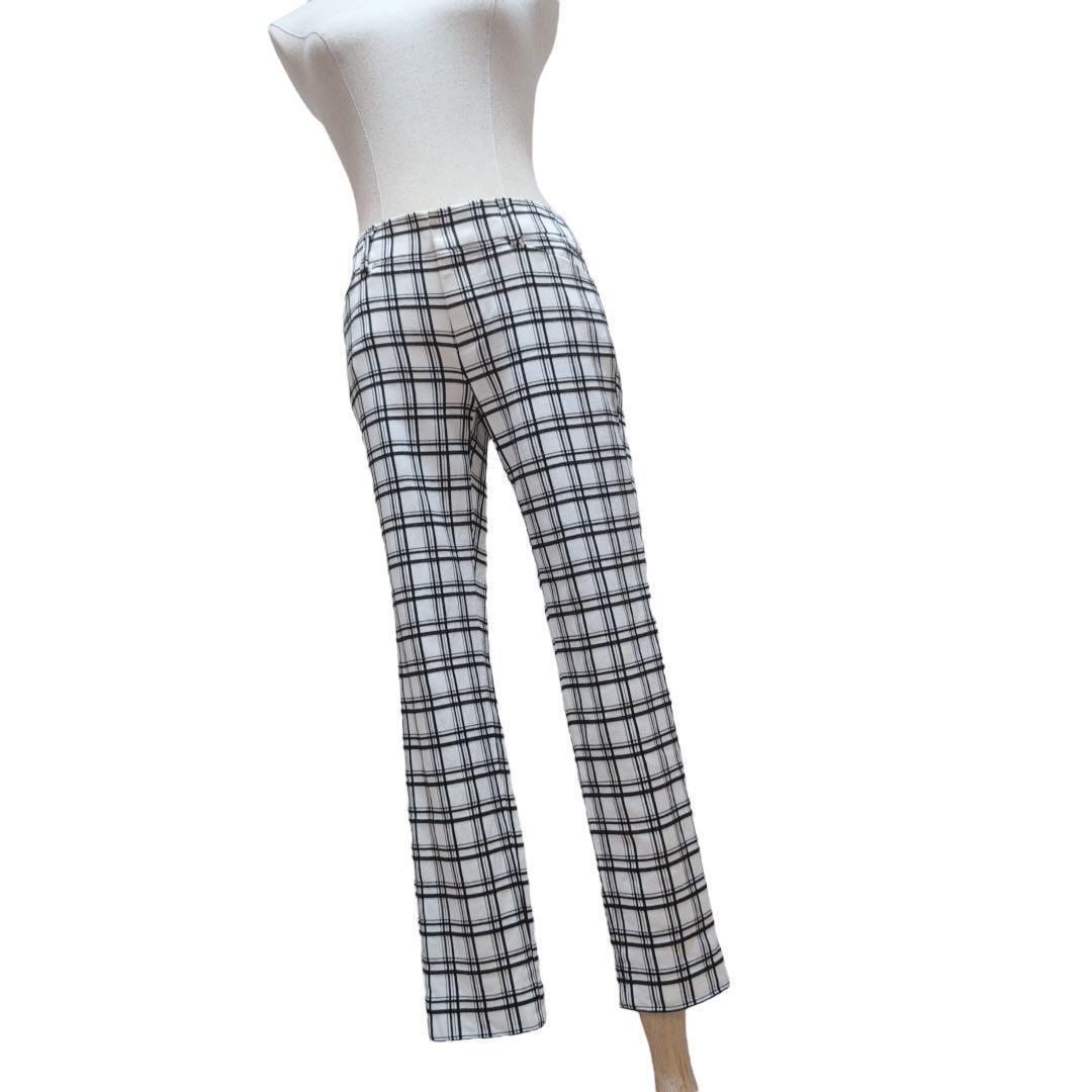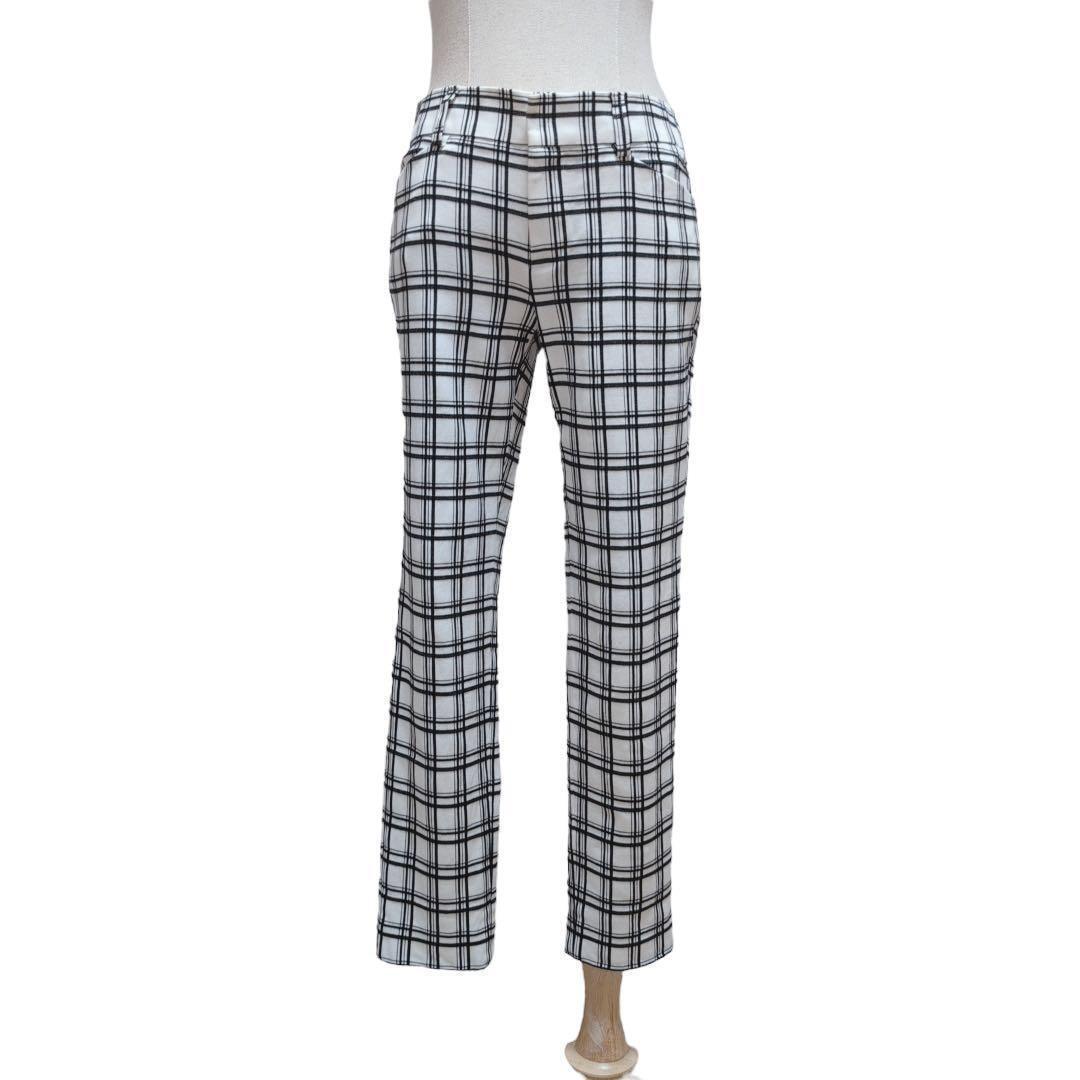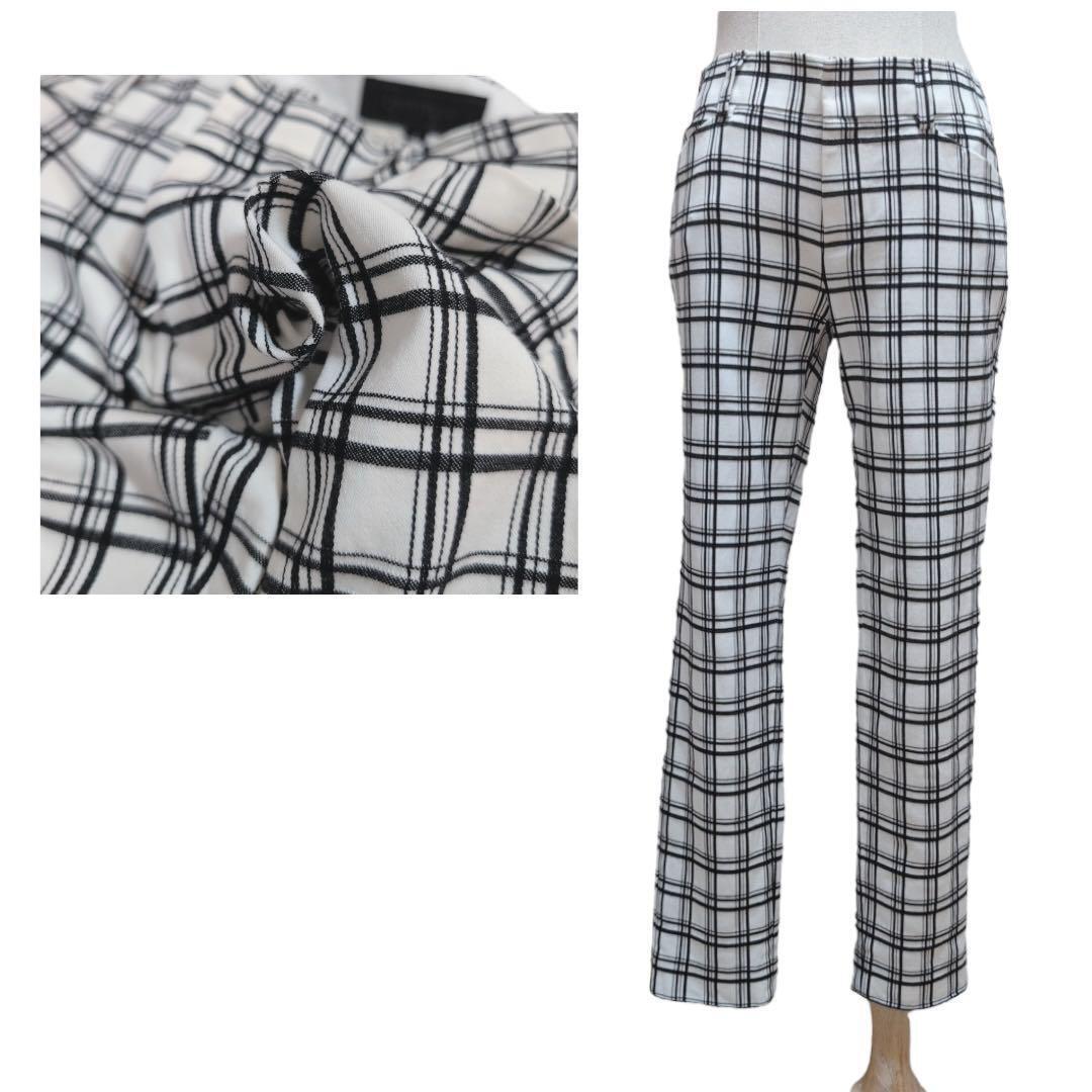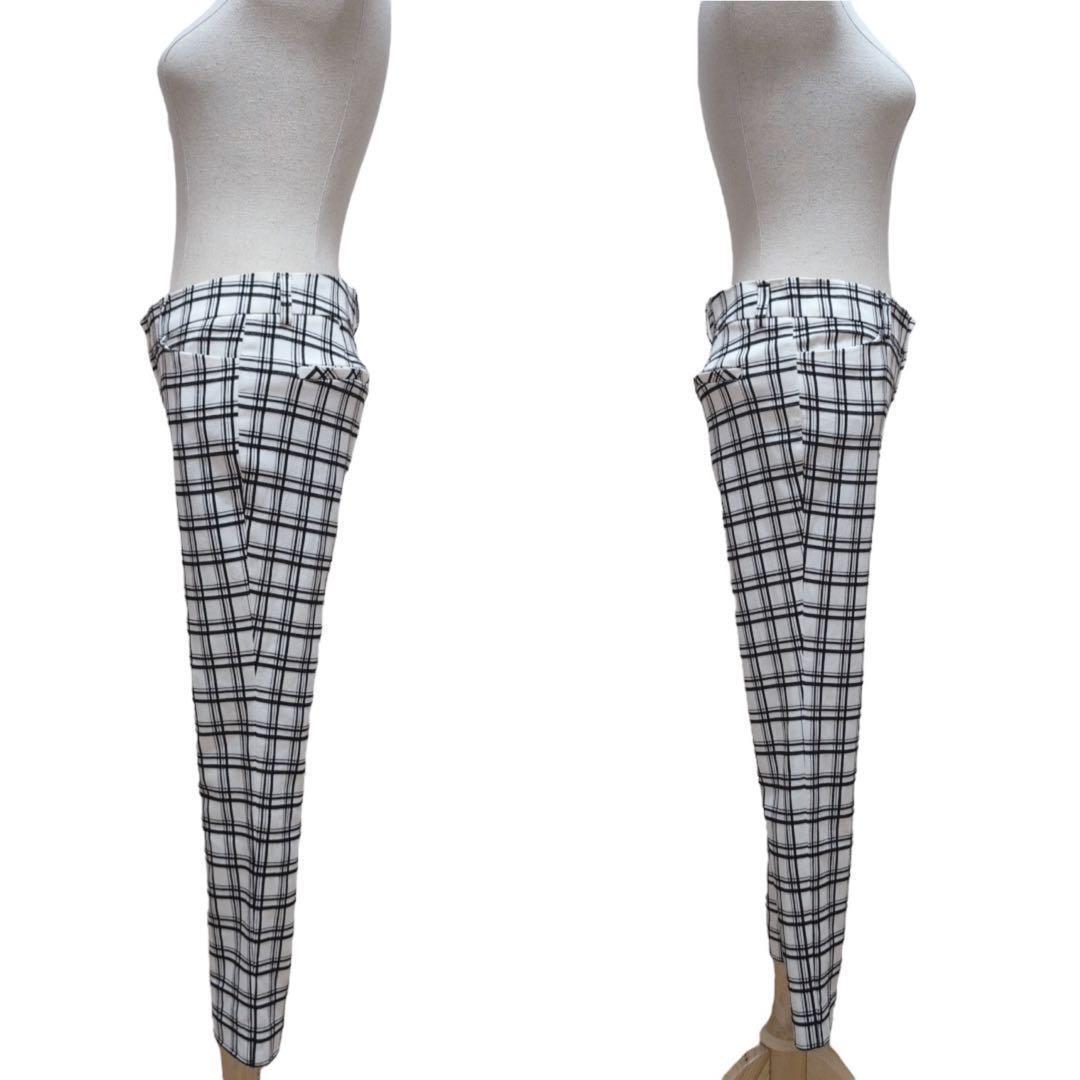 このコーディネートは、白のハイネックトップスに白黒のチェック柄パンツを合わせた、シンプルながらも洗練されたスタイルです