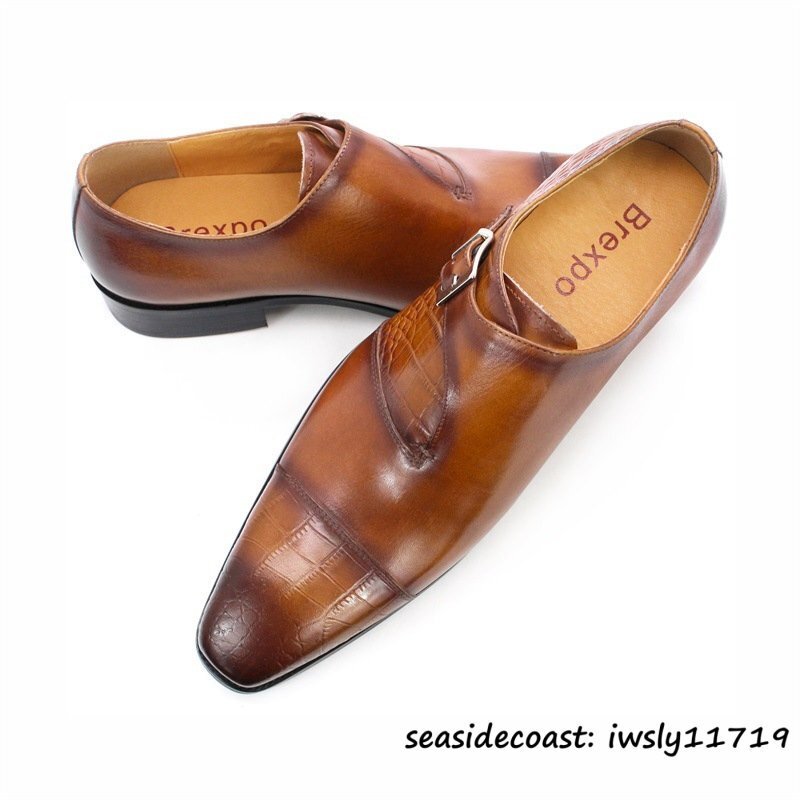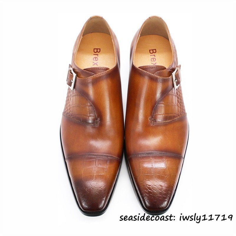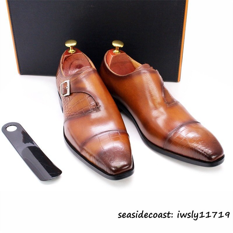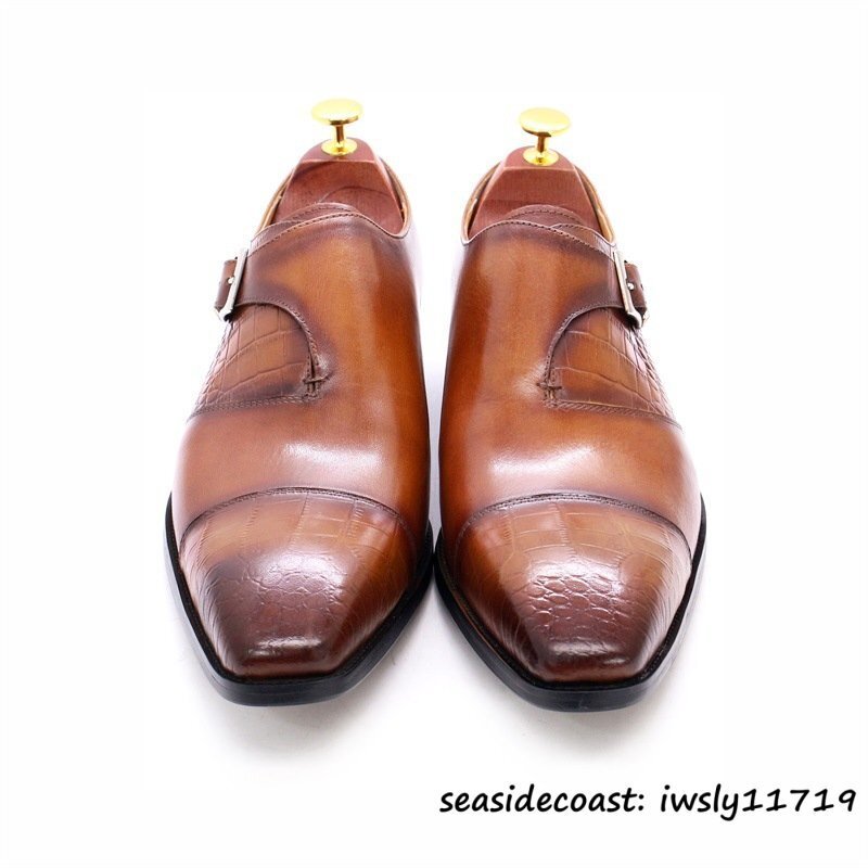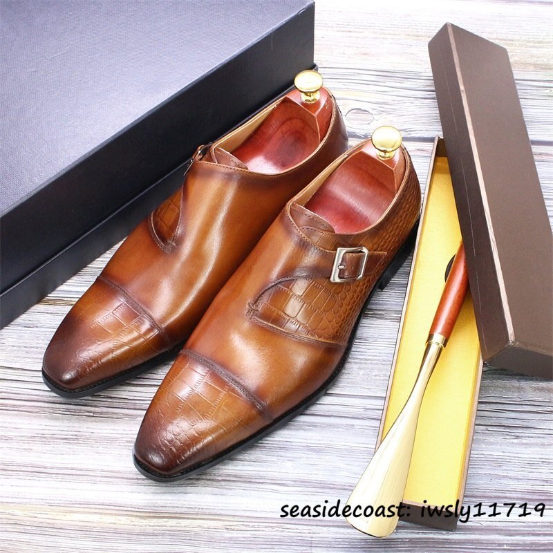 超希少◆ビジネスシューズ メンズ 本革 鰐柄 モンクストラップ レザーシューズ 職人手作り 高級牛革 革靴 紳士靴 結婚式 フォーマル 24.5cm