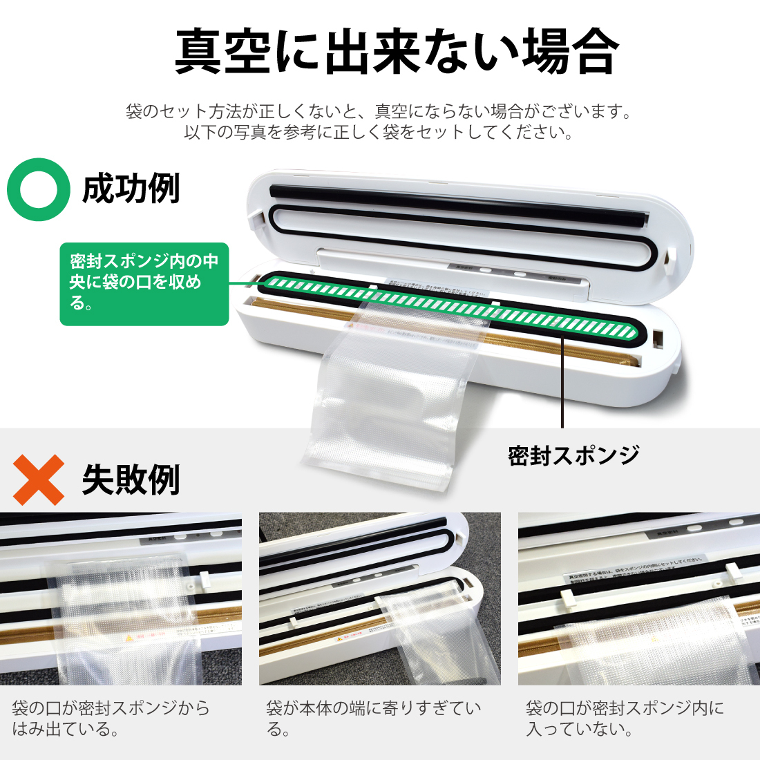・商品付属の専用袋以外の袋を使用した場合、対応基準を満たしている袋であっても商品によっては真空密封や密封できない場合がございます。