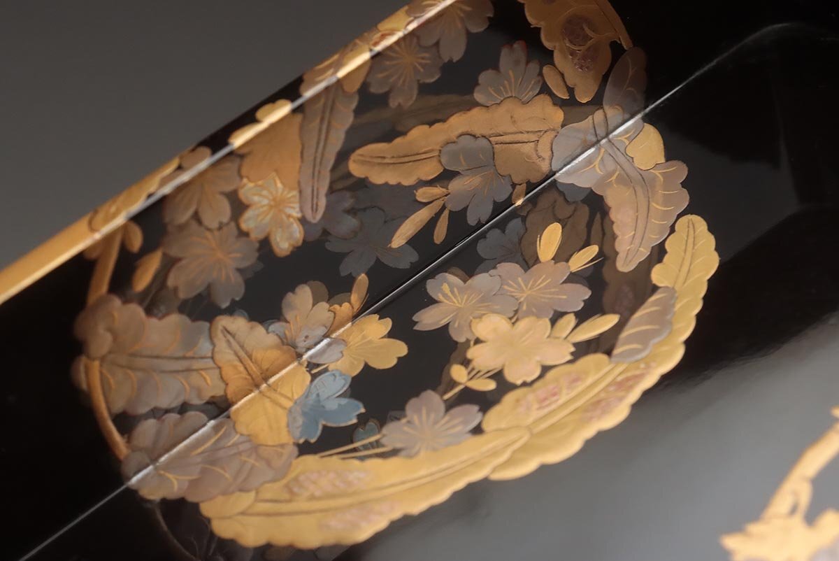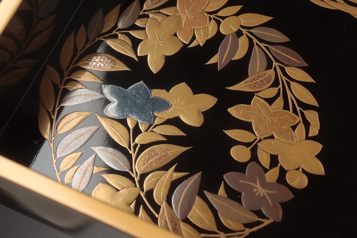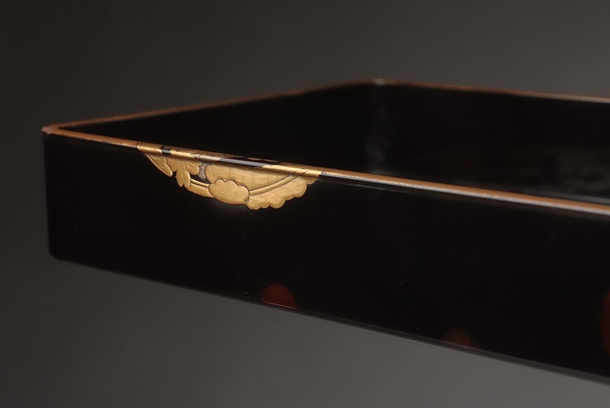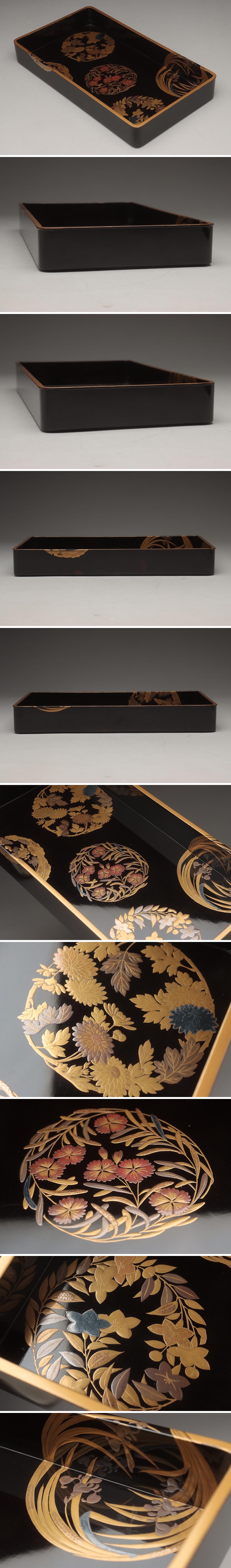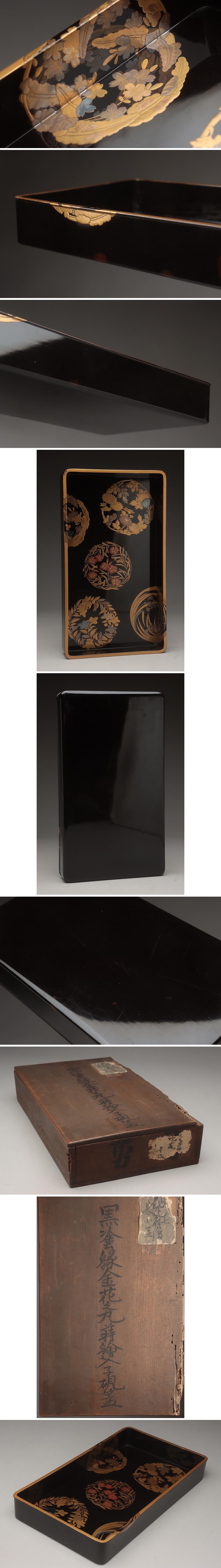 ◆ 時代漆器 黒漆塗 縁金 花丸蒔絵硯蓋 幅26.2cm 木箱附・蒔絵長方盆・蒔絵盆 漆工芸 古美術品 ◆