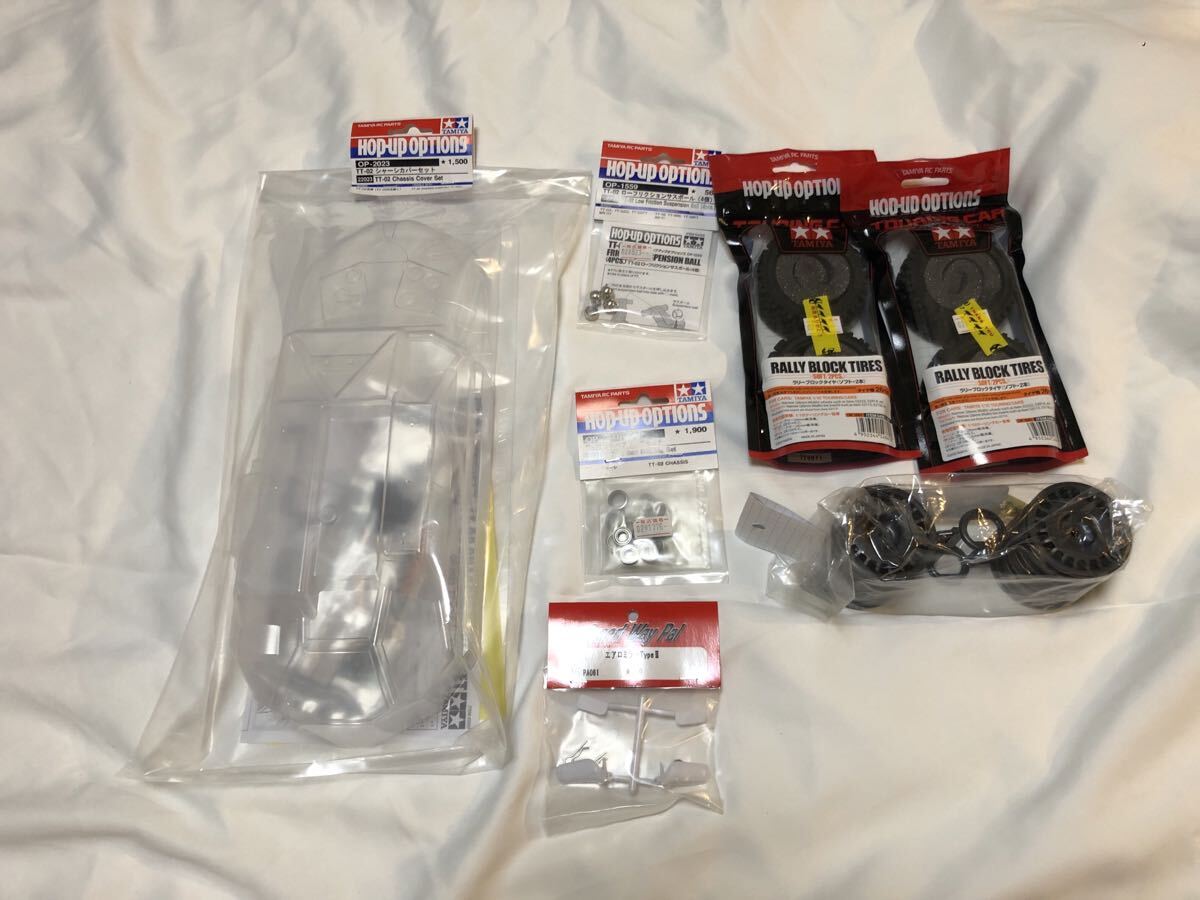 組み立てキット本体、OP-2023、OP-1559、OP-1476、ラリーブロックタイヤ(ソフト2本)×2、ラリホイールガンメタ×4、汎用エアロミラーホワイト