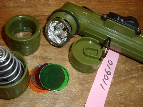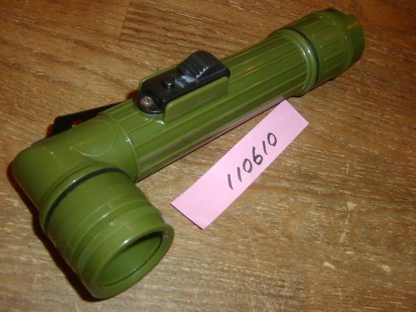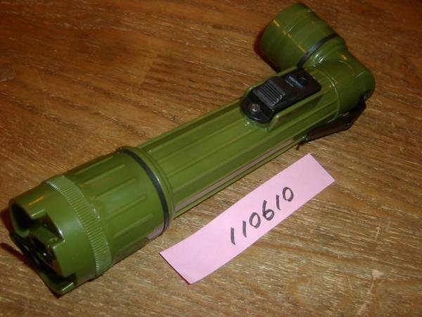 USアーミータイプのL型懐中電灯、LEDにパワーアップ。単3乾電池2本を使用します。スイッチを押すとモールス信号の様に点滅させる事が出来ます。ベルトに引っ掛けるのに便利なクリップ付。サイズは長さが16cm(持ち手直径2.5cm)沖縄離島を除く全国元払い500円でお送りします。落札価格にプラスでお願いします。