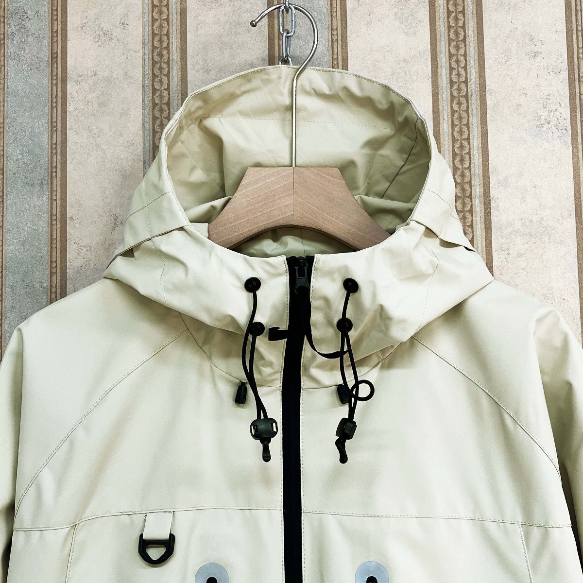 無地のシンプルデザインにフードをプラスし、幅広いスタイルにマッチ。フードと裾にはドローコード付きで、身体にフィットさせることで風や雨の侵入をしっかりガード。胸元には反射テープを施し、夜間の視認性を高めて安全性も確保しています。