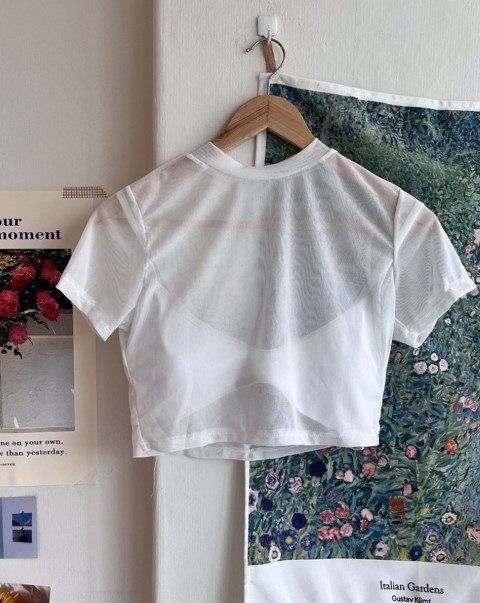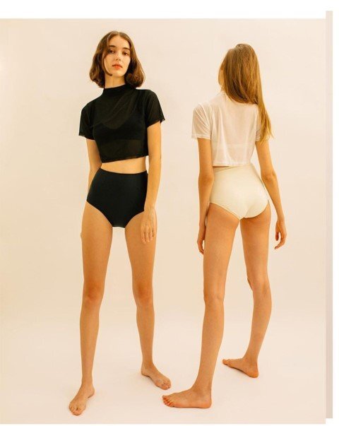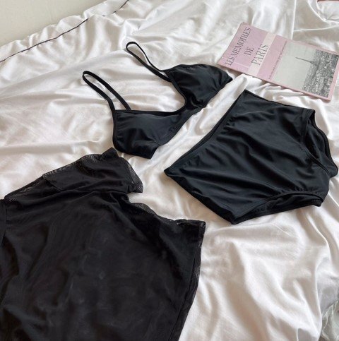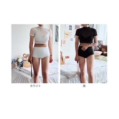 ・透け感が魅力のハイネック水着。お腹をチラッと肌見せ。パッド入りでバストをホールドしてくれます。
