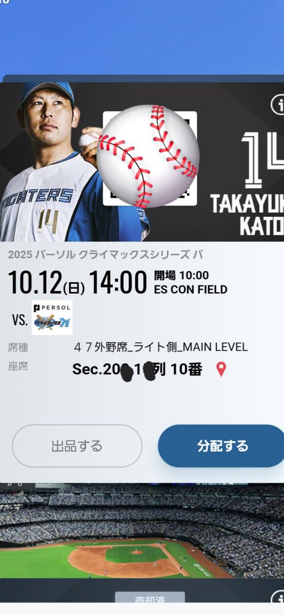 10/12★クライマックスシリーズ第2戦☆日本ハムVSオリックス☆ライト2階☆エスコン★1枚です。