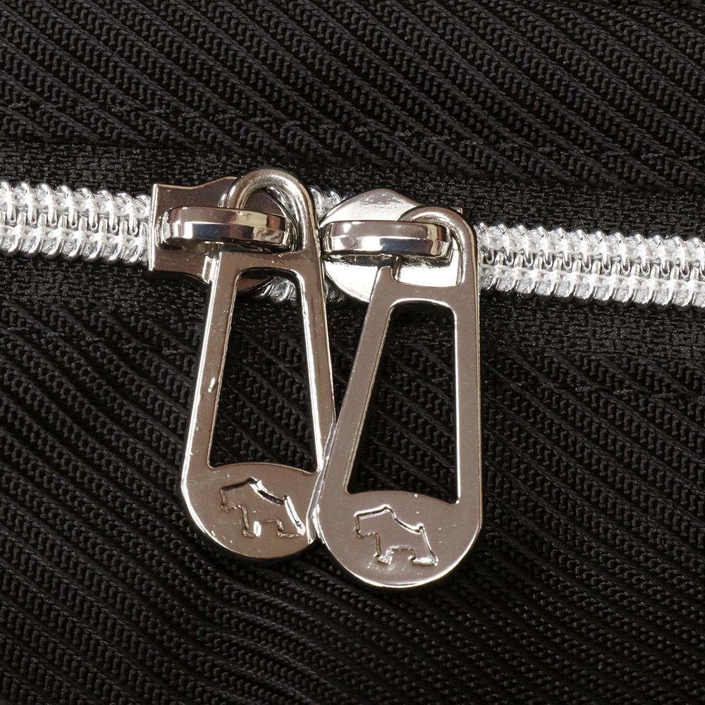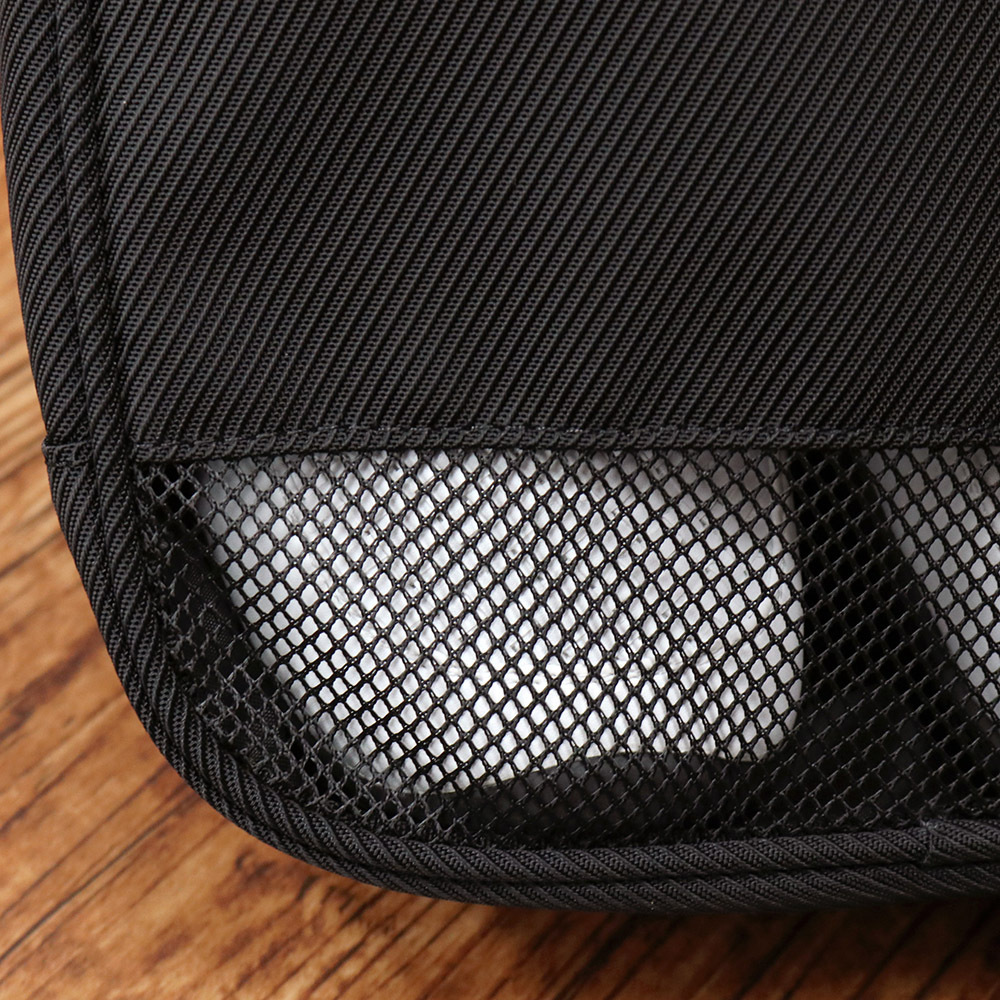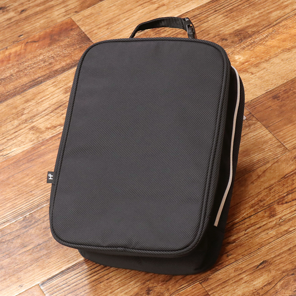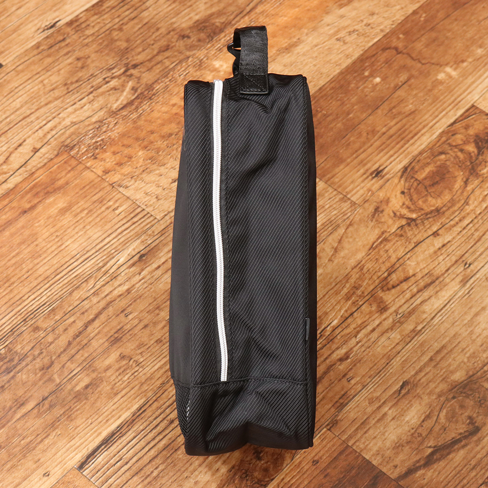 斜め柄が特徴的なダイアゴナル素材を使用した、スポーティーで高級感のあるシューズケース。持ち運びしやすいサイズ感で、持ち手にはバックルを付けているのでキャディバッグなどにパっと止められて大変便利です。下部はメッシュ素材の切替で通気性を確保し、ムレを防ぎます。両開きのファスナーが大きく開くので出し入れもしやすく、使い勝手のよいアイテムです。