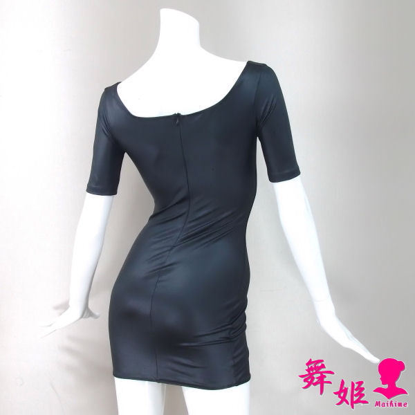 ピッタリフィット系のボディコン衣装です。 大きくあけた首周り、半袖丈、ミニ丈のシンプルで涼しげなデザインで、ストレッチ生地の特性と背割りの立体構造パターンにより、生地が身体にピッタリとフィットし、ボディラインがくっきりと出る衣装です。(衣装の脱ぎ着には背面のコンシールファスナーを開閉します) 極端に短い丈ではありませんので着用へのハードルは高くないかもしれませんが、丈の短さよりもボディラインが強調されてしまうことの方が、抵抗感が大きいかもしれません。 | ||||||||||||||||||||||||||||||||||||||||||||||||||