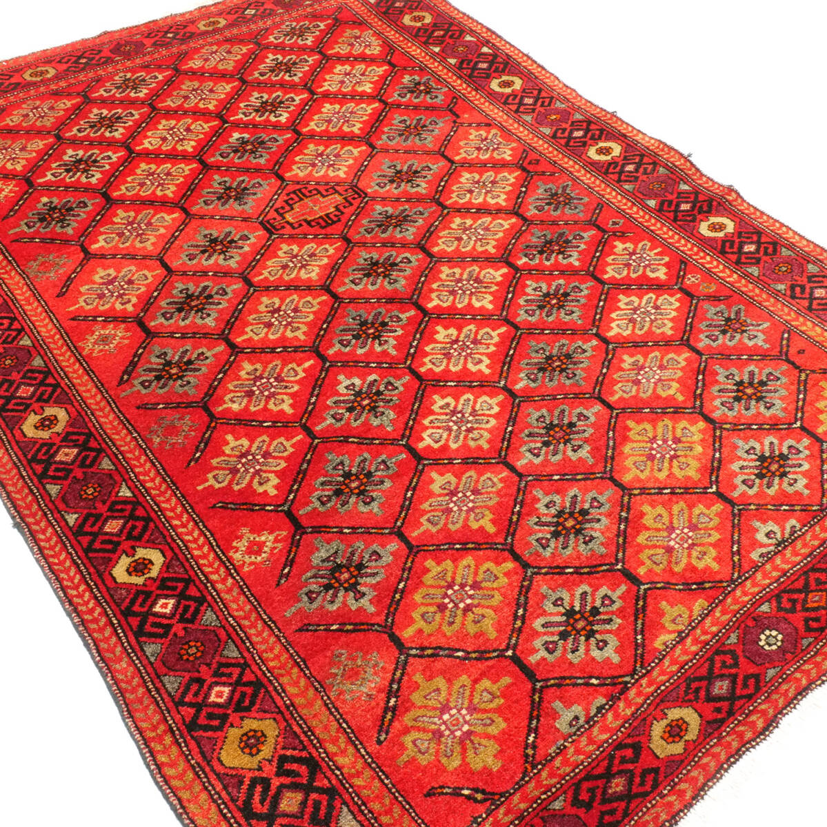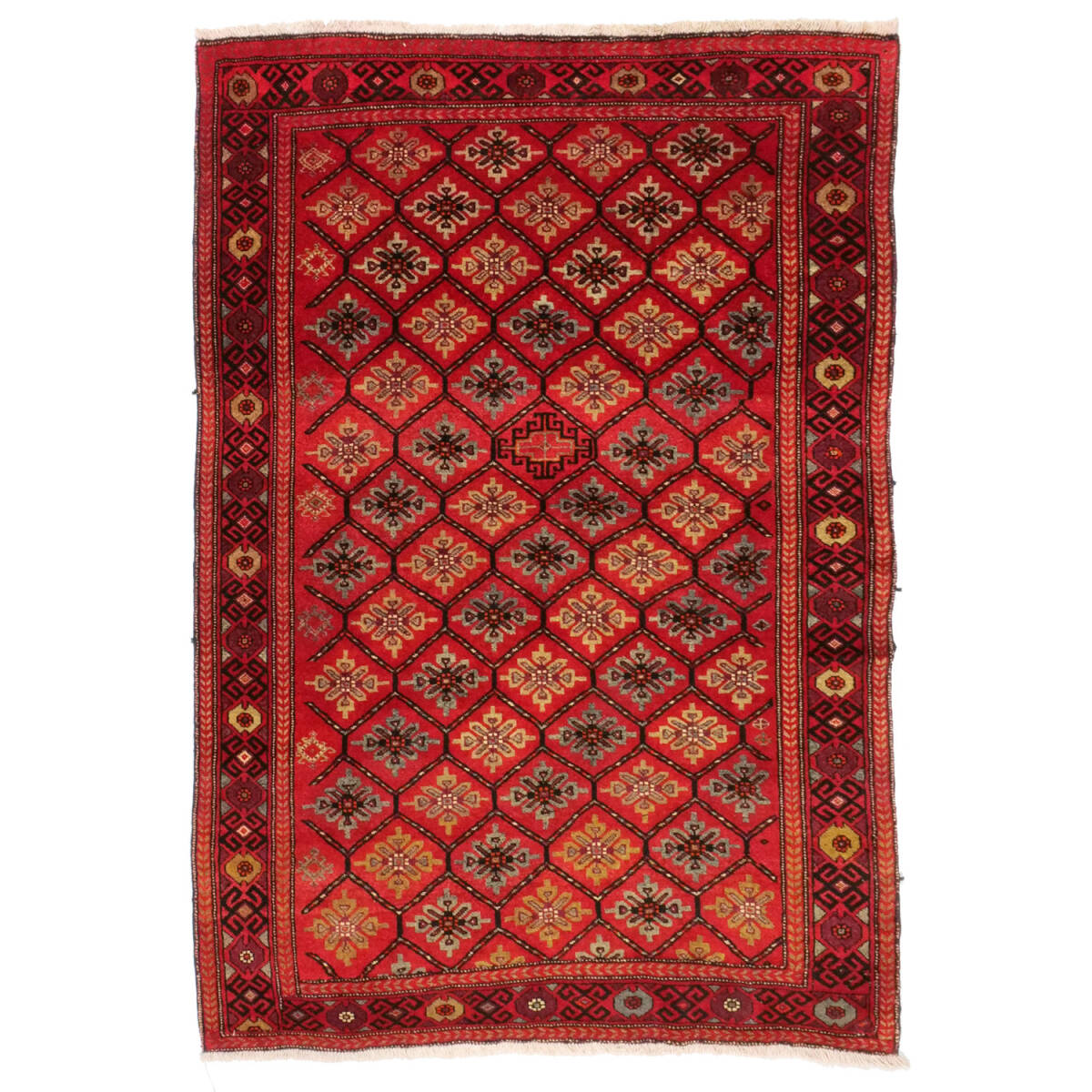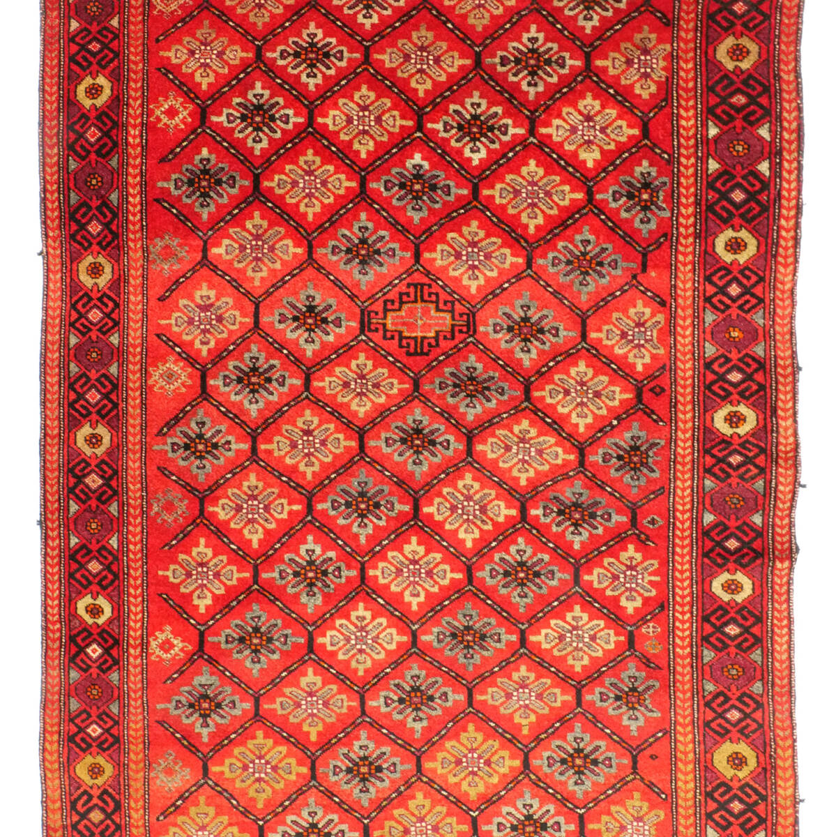 1960年代に織られたシールヴァン産のセミアンティークラグです。フィールド全体には花を連ねたミナハニ文様が並び、中央には一つだけエルサリギュルが織り込まれています。この希少な構成は、織り手の遊び心や象徴的な意味を感じさせ、作品に個性的な魅力を与えています。2200×1520mmのサイズはリビングやソファ前などにも最適です。