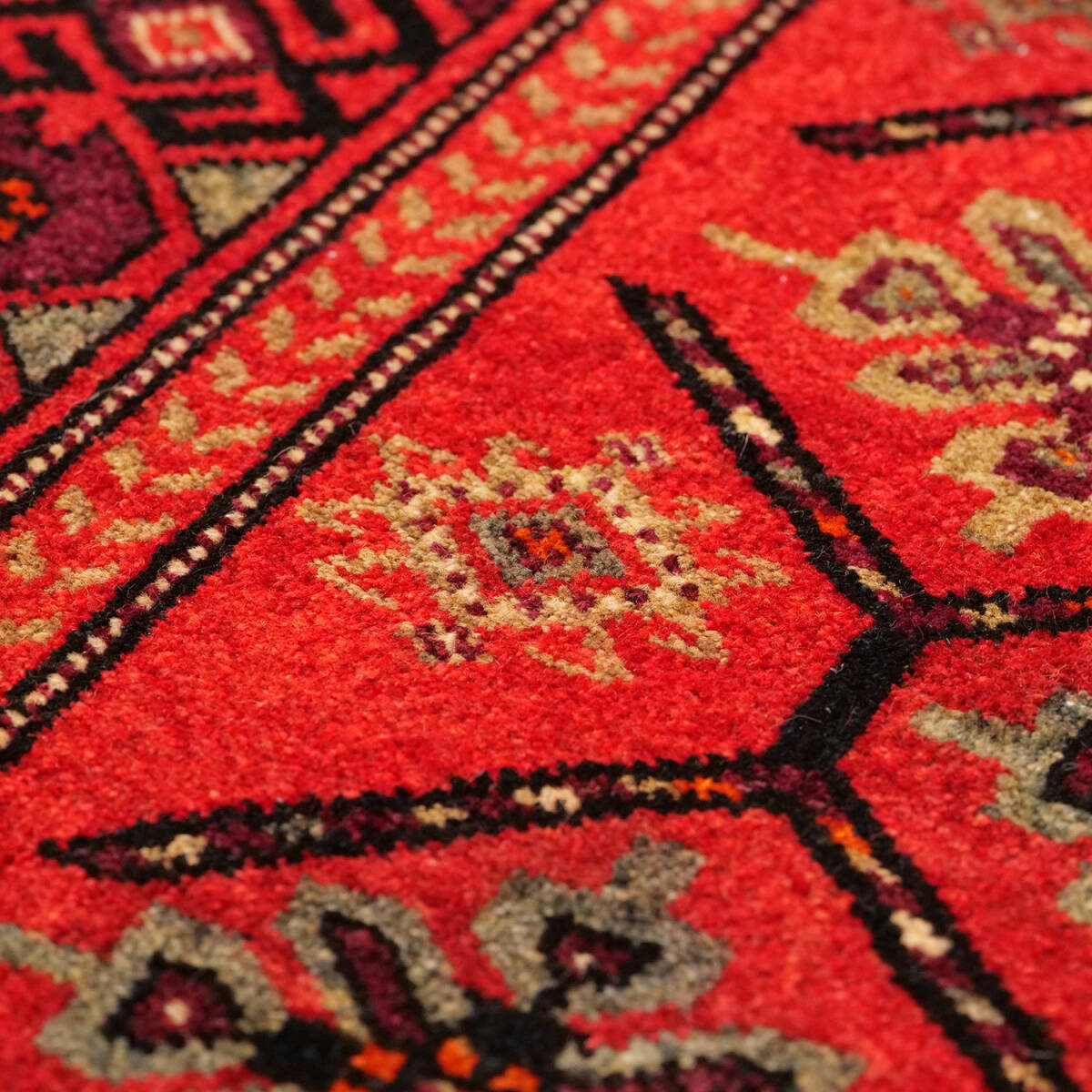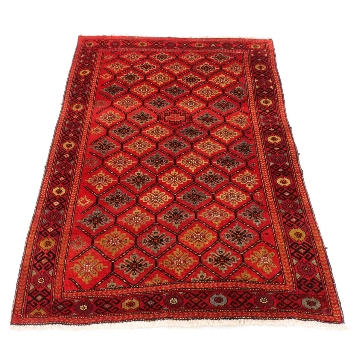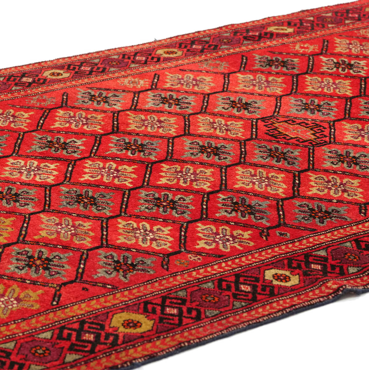 1960年代に織られたシールヴァン産のセミアンティークラグです。フィールド全体には花を連ねたミナハニ文様が並び、中央には一つだけエルサリギュルが織り込まれています。この希少な構成は、織り手の遊び心や象徴的な意味を感じさせ、作品に個性的な魅力を与えています。2200×1520mmのサイズはリビングやソファ前などにも最適です。