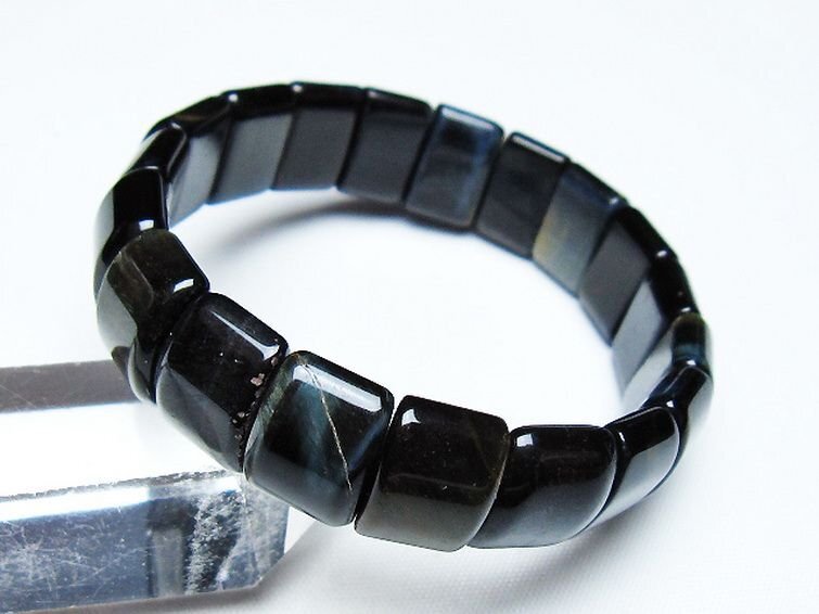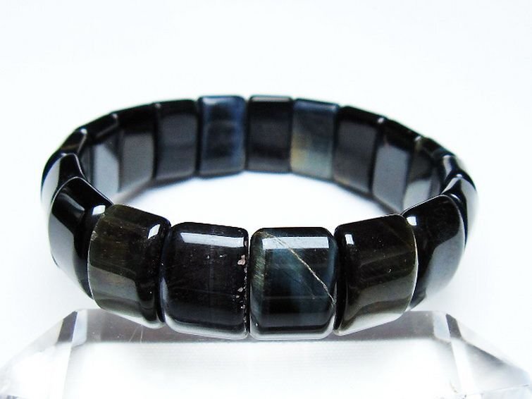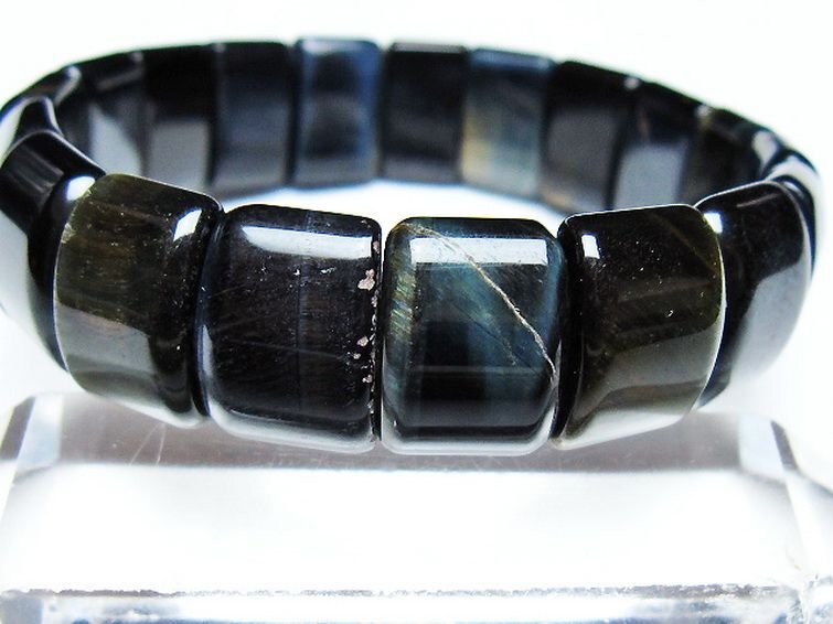 ■商品名: ブルータイガーアイ※青虎目石バングル ■商品ID: T173-5050 ■商品重量:約 36g ■商品サイズ: 高約:15mm 横約:10mm 厚約:6mm 内径円周約:156mm(±5mm) 【タイガーアイ(虎目石)】 タイガーアイは角閃石の一種のクロシドライト(青石綿)に石英が染み込んで酸化し、茶色や黄金色になったものです。 研磨すると光の当たり具合によってキャッツアイ効果、またはシャトヤンシー効果と呼ばれる猫の目のような光の筋が見られ、その輝きと黄金色と褐色の縞模様が虎の眼に見えることからこの名前が付けられました。 ベーシックな金茶色の他にも様々な色合いがあり、温度が高い環境で生成されると深い赤みを帯びたレッドタイガーアイになります。 この他にクロシドライトが酸化せずに生成された灰色のグレータイガーアイは「ウルフズアイ(狼目石)」、濃青色をしたブルータイガーアイは「ホークアイ(鷹目石)」と呼ばれ、タイガーアイとは区別される場合があります。 タイガーアイは視野を広げ正しい判断力と行動力で成功へ導くとされ、ルチルクォーツに匹敵するほどの金運・仕事運アップストーンとして高い知名度と人気を誇っています。 また男性イメージの強い石ではありますが、強力な邪気払い・トラブル回避の効果も持ち合わせていますので女性にはストーカーやセクハラ対策のお守りとしても有用です。 ⇒ タイガーアイをもっと詳しく ◆ワンポイント情報 タイガーアイは塩分によって劣化しやすいので汗が付いた場合は柔らかい布で拭き取るようにし、塩を用いた浄化は行わないように注意しましょう。 |